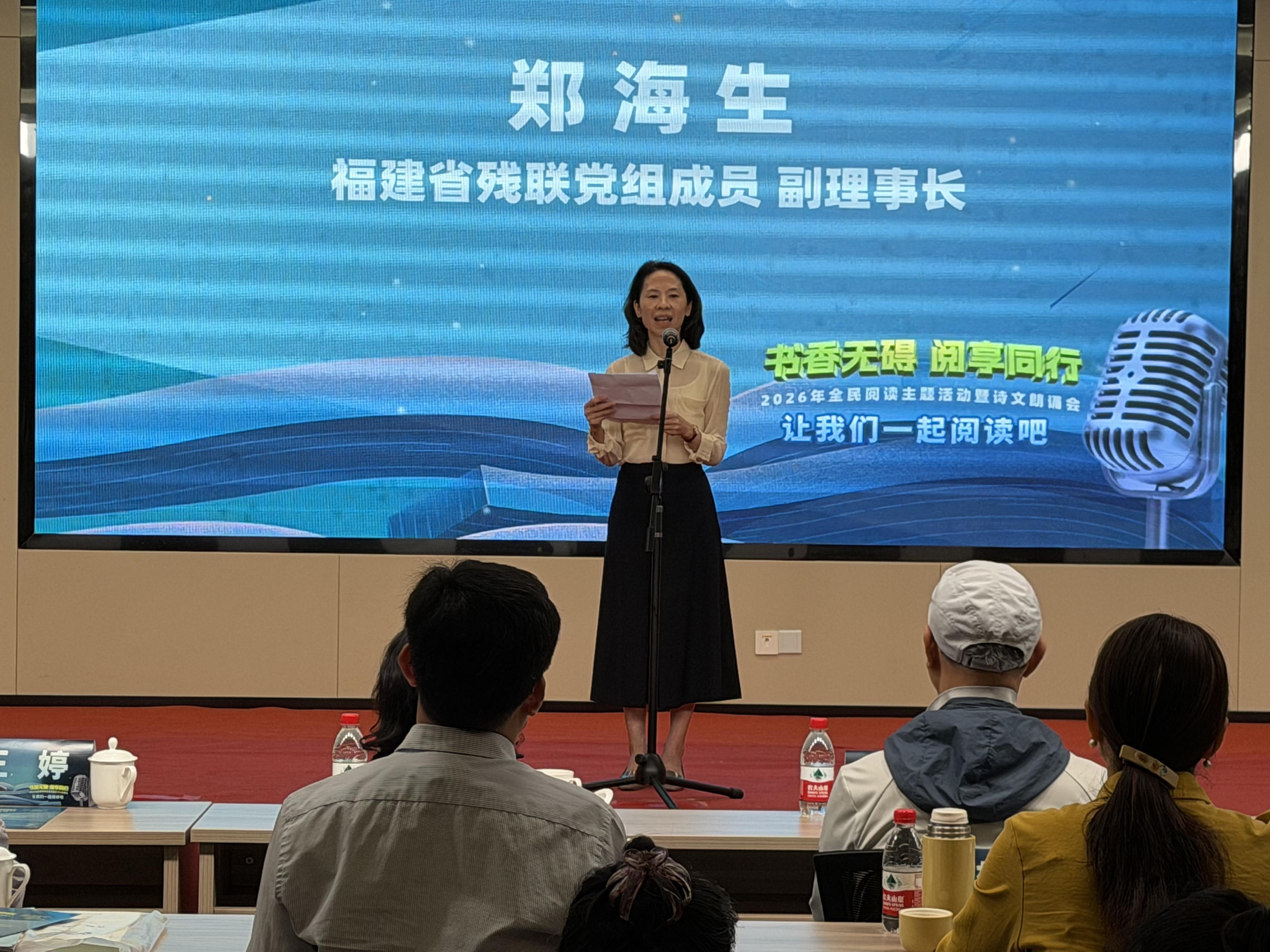 东南网4月19日讯(本网记者 薛莞馨 文/图)4月19日下午,“书香无碍・阅享同行”2026年全民阅读主题活动暨诗文朗诵会在福建省图书馆举办。本次活动紧扣《全民阅读促进条例》实施要求,响应中国残联五大残疾人专门协会“让我们一起阅读吧”行动倡议,以阅读为桥,为残健群体搭建起融合交流的文化舞台,让书香跨越障碍,温暖直抵人心。省残联领导、残疾人代表、青年志愿者、爱心人士齐聚现场,共赴一场浸润心灵的阅读之约。