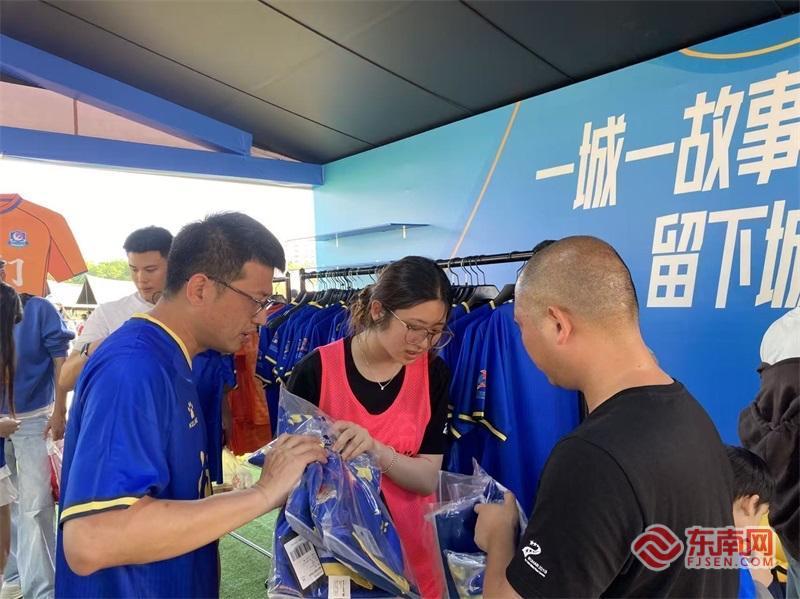 球迷购买球衣。 “太有氛围感了,像过节一样。”福州市民陈晓波带着妻儿和父亲一家四口专程前来观赛。一家人早早到场,打卡拍照、逛逛市集,选购球衣,全程兴致满满。陈晓波坦言,得知“闽超”举办,便立刻在网上抢票,“难得在家门口办这么棒的赛事,不仅想支持家乡球队,还想让喜欢足球却没看过现场比赛的孩子感受这份热烈氛围。”