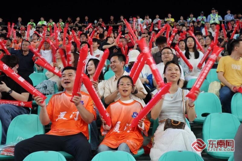 球迷为支持队伍加油打气。 看台上球迷们挥舞旗帜,为支持的队伍加油打气。厦门球迷为支持赛事特地组建“鹭战队”,统一购置服装、标语、旗帜,组织约700人乘坐14辆大巴来福州观赛。