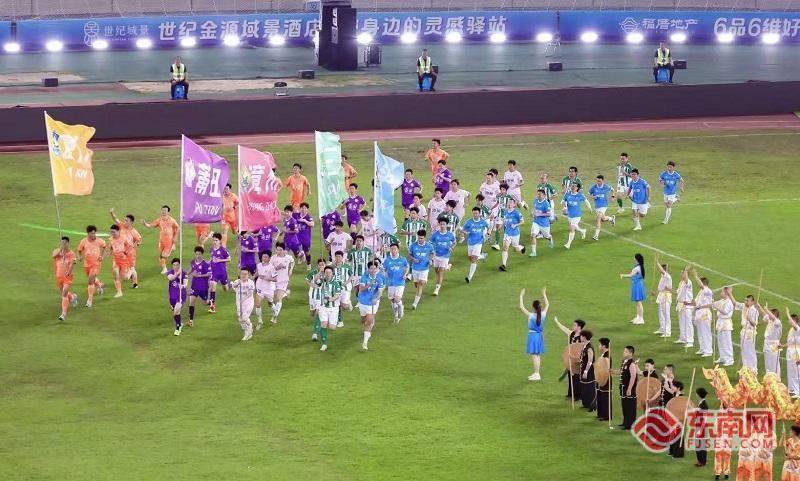 球队亮相。 今晚,10支球队同时亮相,引起全场的欢呼。10支队伍、482名注册球员均是纯草根选手,年龄最大的45岁,最小的16岁,有学生、教师、企业职工、个体户……既有土生土长的福建人,也有通过上学、工作、买房落户的新市民,还有在福建生活工作的台湾同胞球员。
