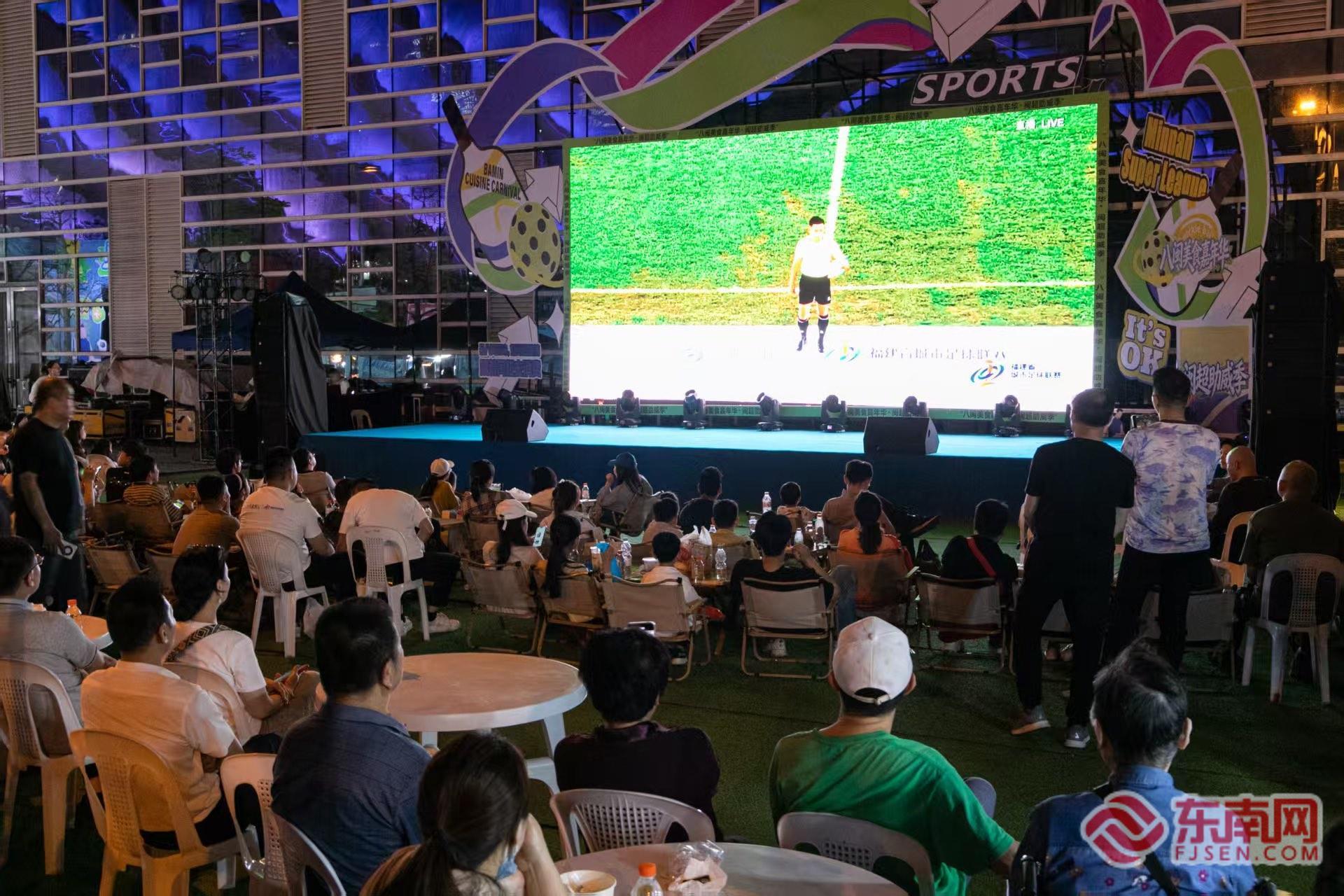 市民在场外看直播。 比赛场外同样热闹非凡。福州市区设置了近20个官方第二现场观赛点,覆盖鼓楼、台江、仓山、晋安等主要城区和周边县市,东百中心、仓山万达、金融街万达等热门商圈都有大屏直播。高清大屏配氛围音响,现场还推出了打卡送券、消费满减、餐饮打折等活动——逛着街、吃着饭,顺便把球赛看了,美滋滋!足球配美食,边吃边看才够味。