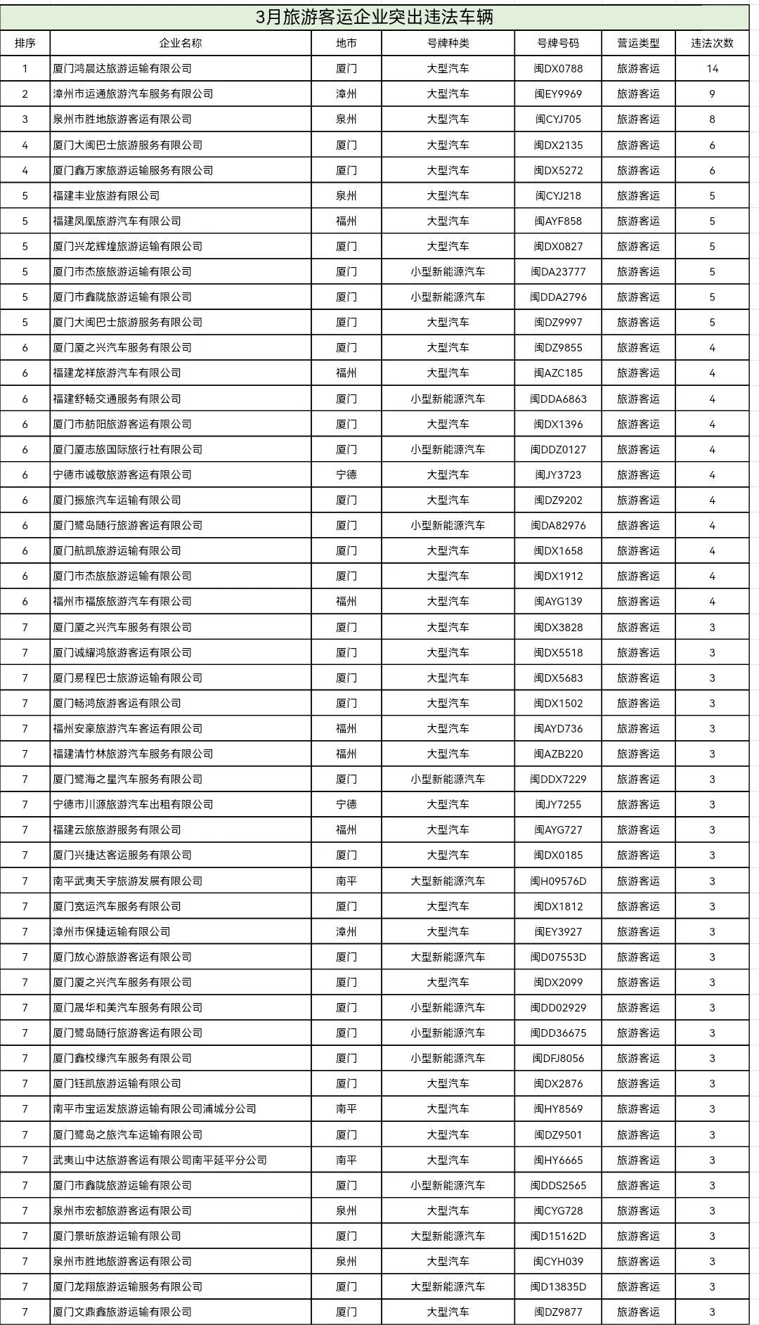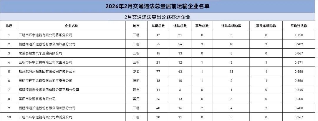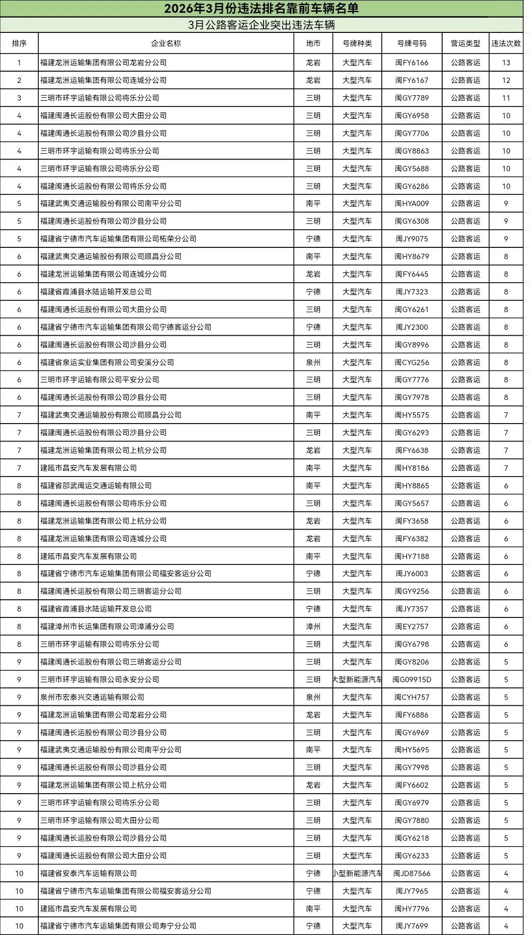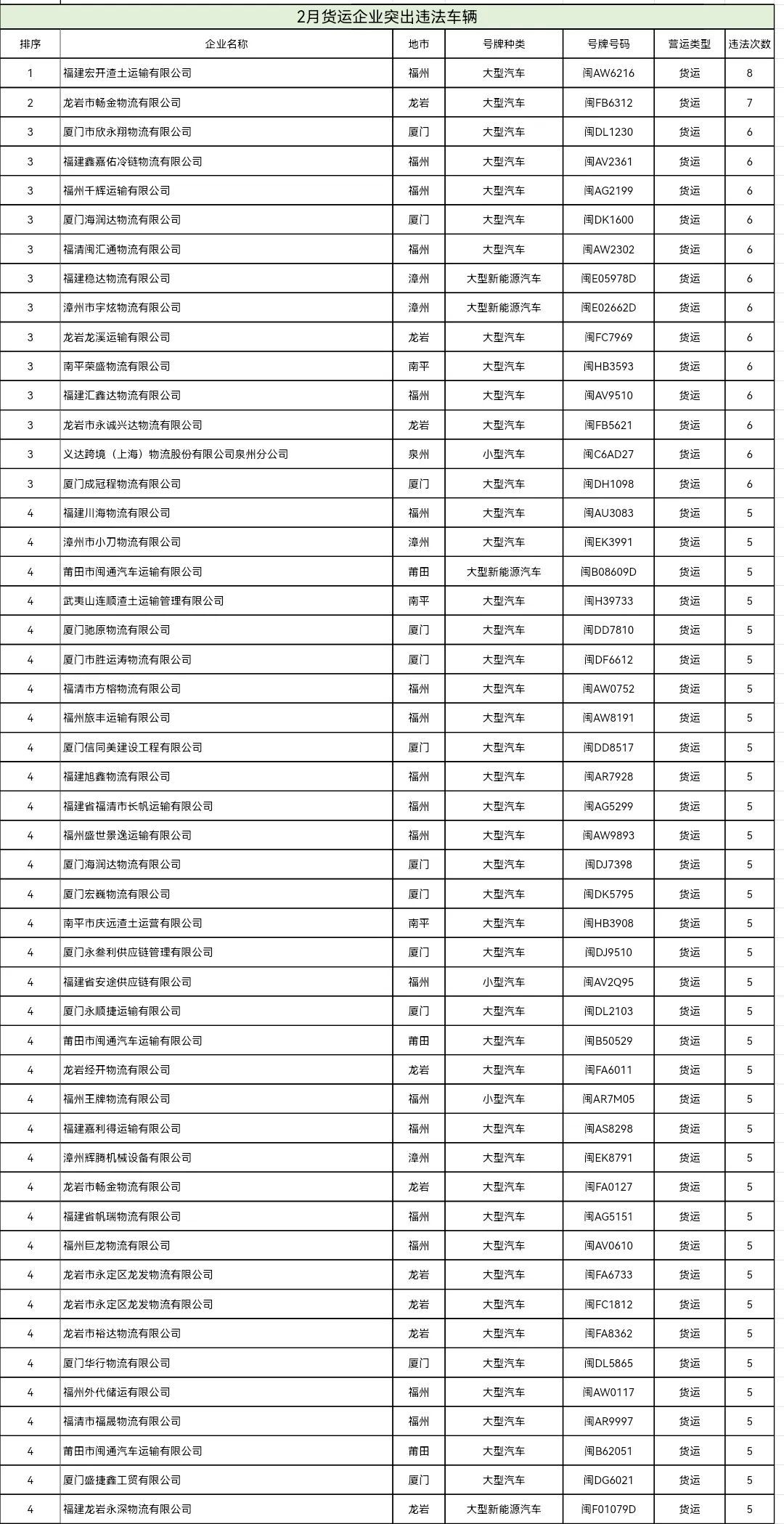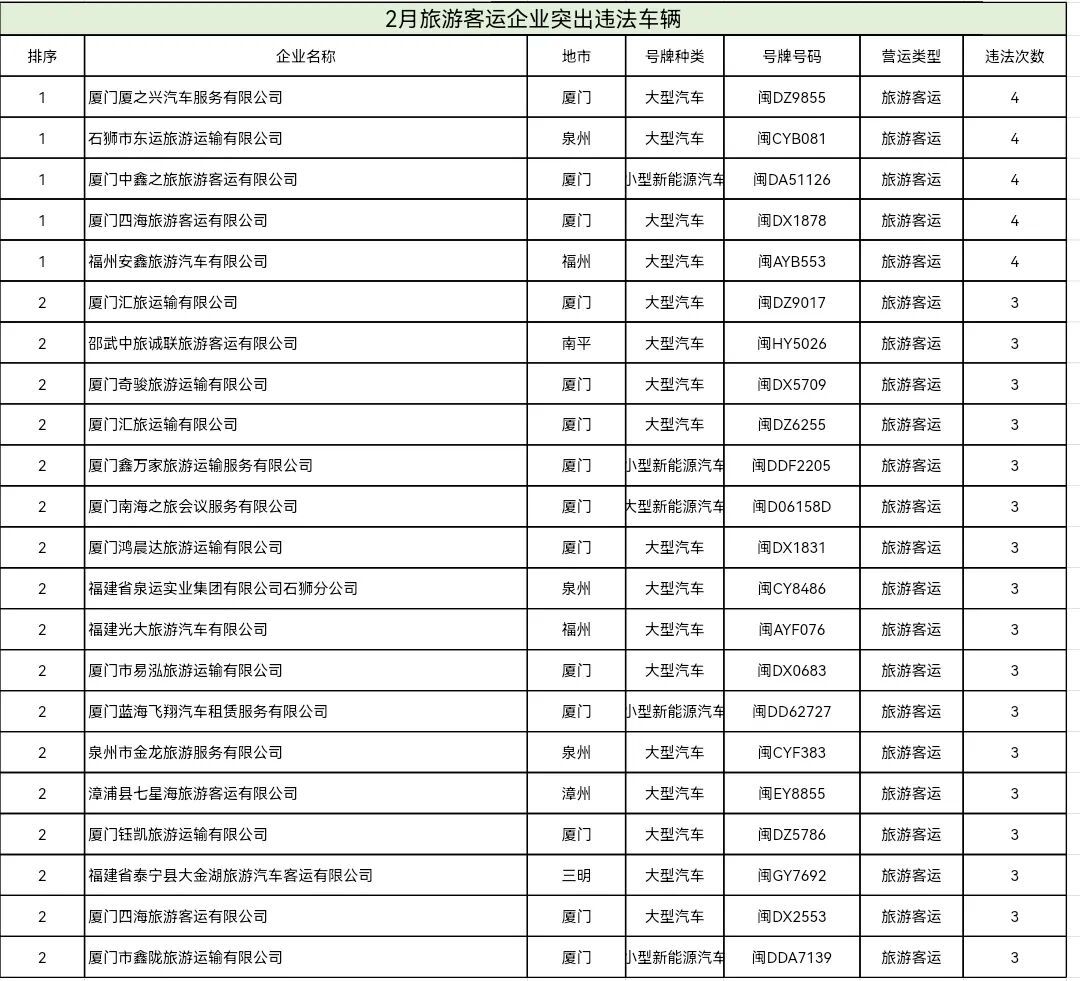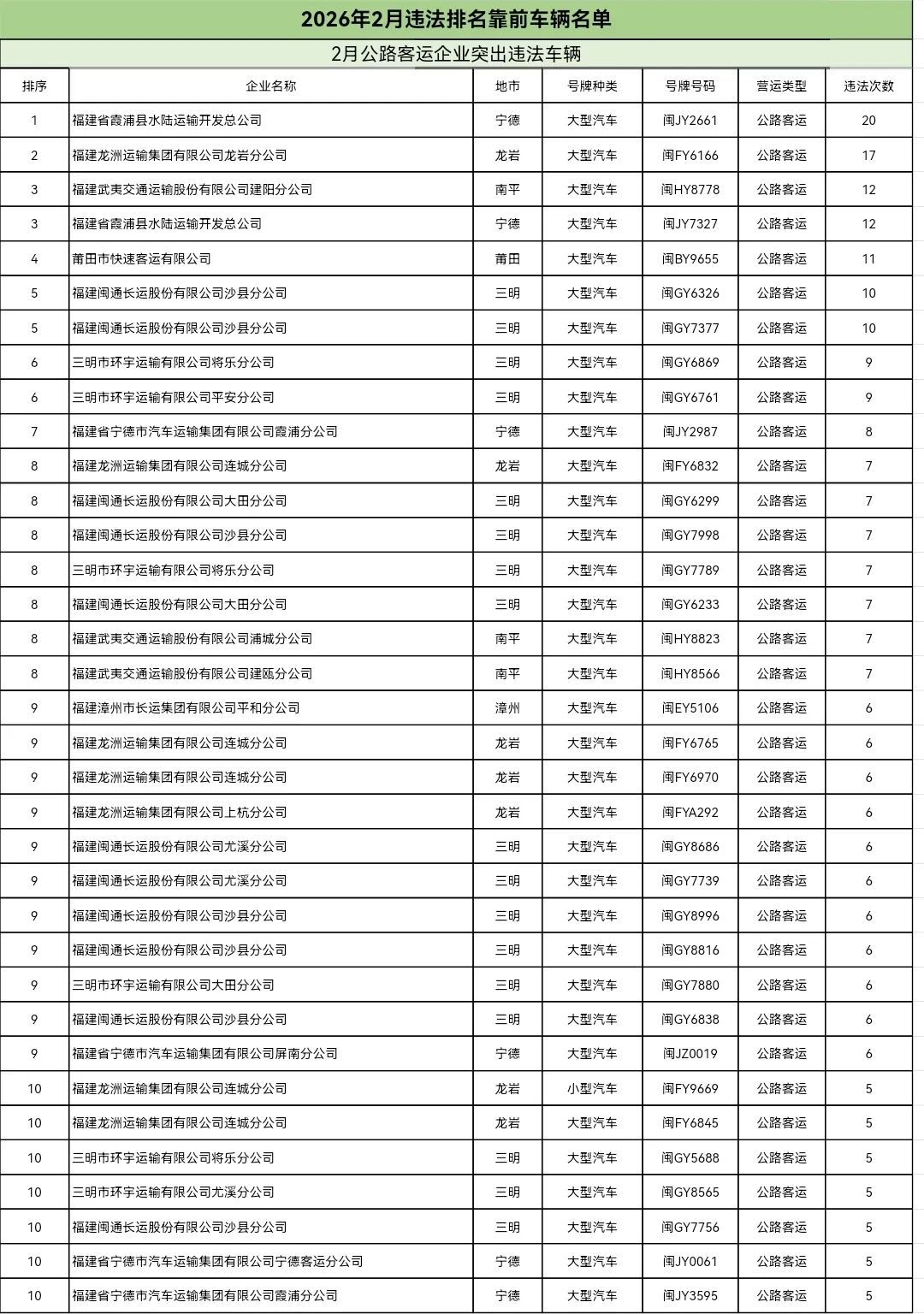 东南网4月20日讯(本网记者 翁莉)日前,福建省公安厅交通管理总队集中曝光2026年2—3月全省公路客运、普通货运、旅游客运、危险货物运输四类重点行业中,交通违法总量居前的运输企业及车辆名单,通过公开警示压实企业主体责任、强化源头风险治理。 交警部门提醒,当前正值春季,全省务农务工、采茶踏青、客货运输出行高度叠加,春耕生产与群众出行迎来双重高峰,加之降雨天气频发,路面湿滑、视线受阻,道路交通安全风险显著上升。为切实防范化解春季道路风险隐患,有效预防和减少道路交通事故,全省正深入开展春季道路交通安全综合整治行动,重点治理春季易发多发的各类交通违法行为。广大交通参与者应注意出行安全,拒绝酒驾醉驾,不超员、不超速、不疲劳驾驶,全员全程系好安全带。广大驾驶人要自觉遵守交通法规,雨天行车务必牢记“降速、控距、亮尾”,谨慎驾驶、安全通行。 2026年2月份交通违法突出车辆名单