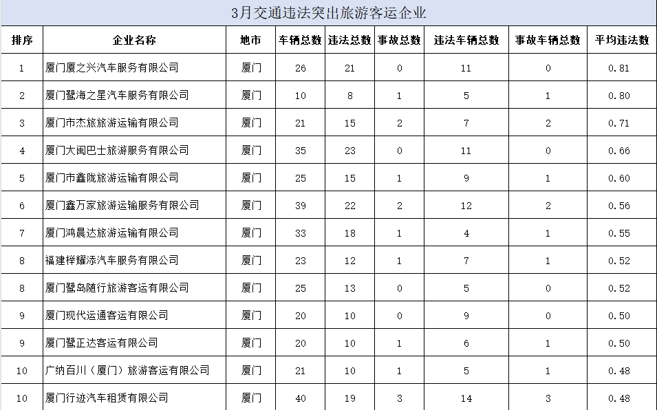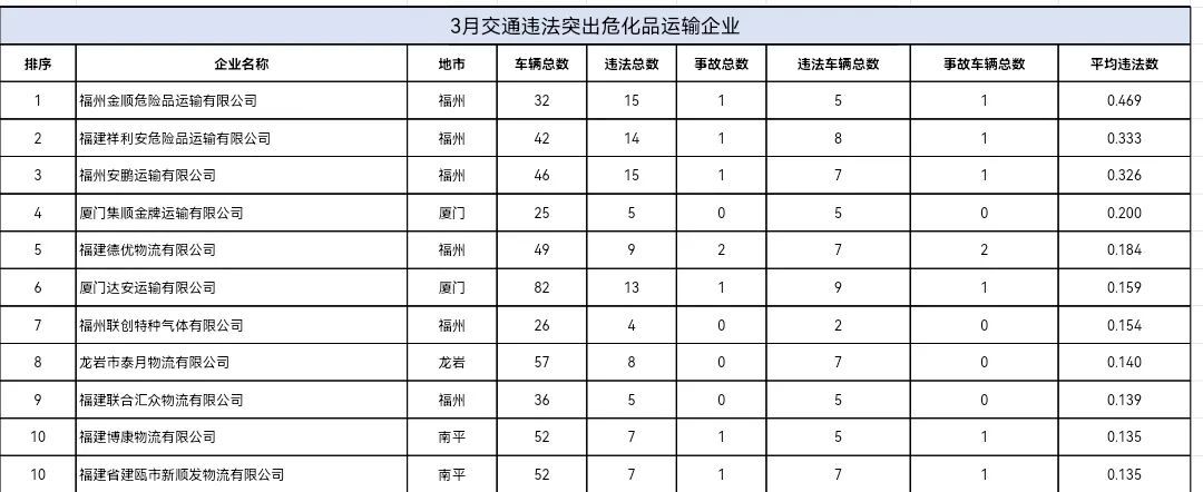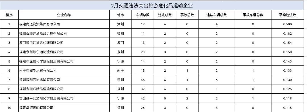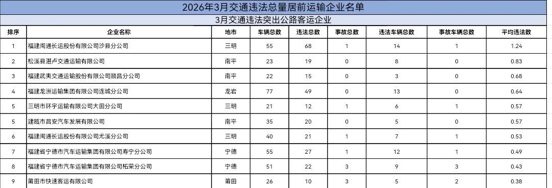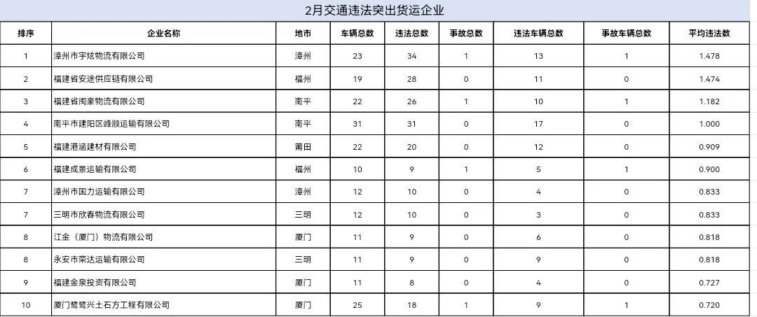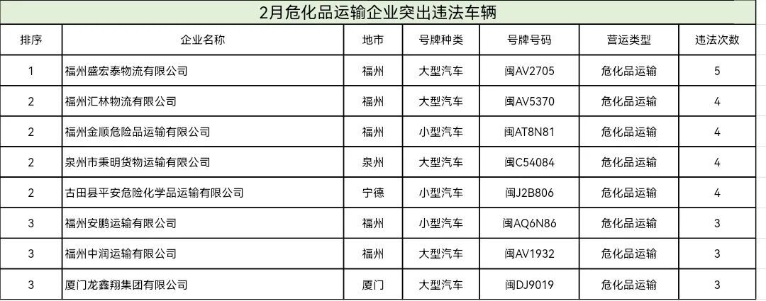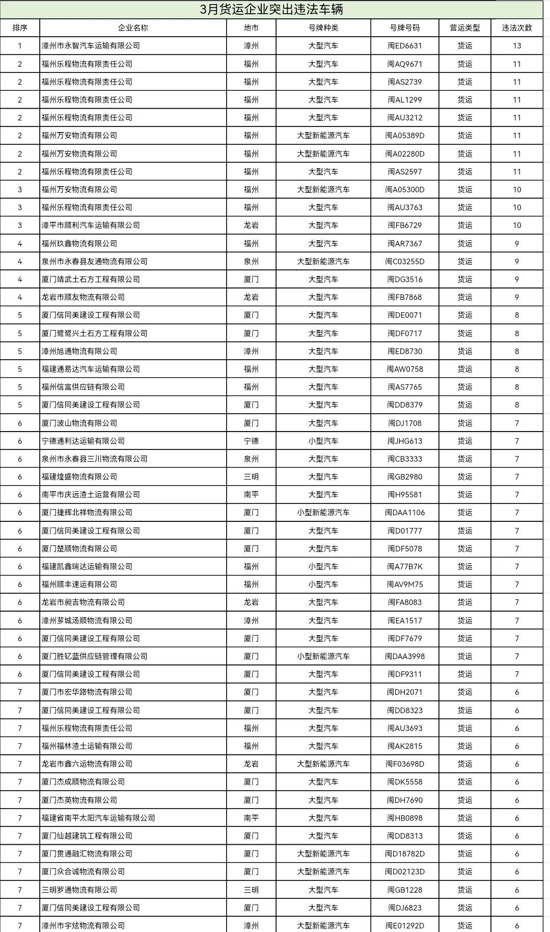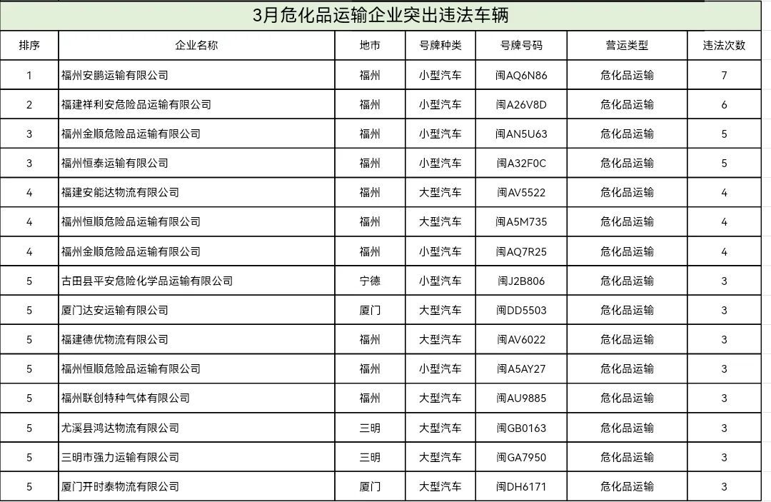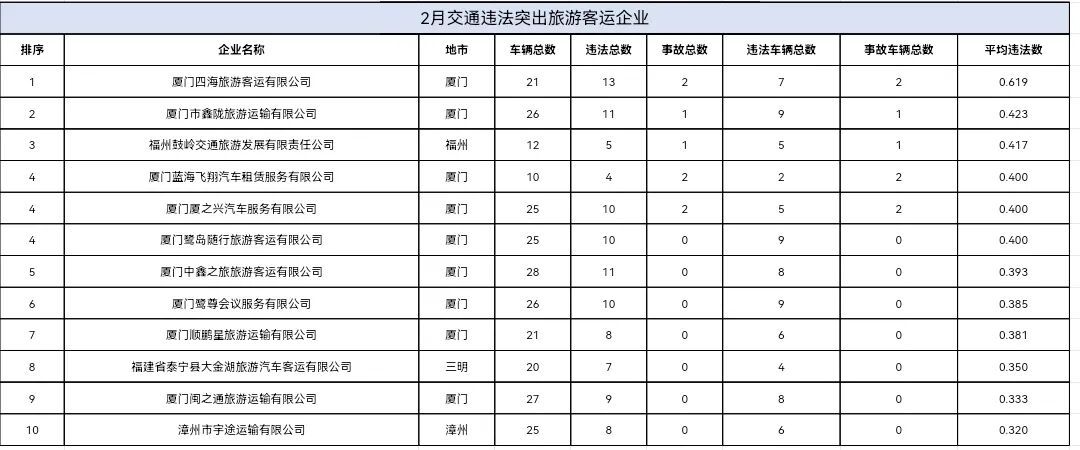 东南网4月20日讯(本网记者 翁莉)日前,福建省公安厅交通管理总队集中曝光2026年2—3月全省公路客运、普通货运、旅游客运、危险货物运输四类重点行业中,交通违法总量居前的运输企业及车辆名单,通过公开警示压实企业主体责任、强化源头风险治理。 交警部门提醒,当前正值春季,全省务农务工、采茶踏青、客货运输出行高度叠加,春耕生产与群众出行迎来双重高峰,加之降雨天气频发,路面湿滑、视线受阻,道路交通安全风险显著上升。为切实防范化解春季道路风险隐患,有效预防和减少道路交通事故,全省正深入开展春季道路交通安全综合整治行动,重点治理春季易发多发的各类交通违法行为。广大交通参与者应注意出行安全,拒绝酒驾醉驾,不超员、不超速、不疲劳驾驶,全员全程系好安全带。广大驾驶人要自觉遵守交通法规,雨天行车务必牢记“降速、控距、亮尾”,谨慎驾驶、安全通行。 2026年2月份交通违法突出车辆名单