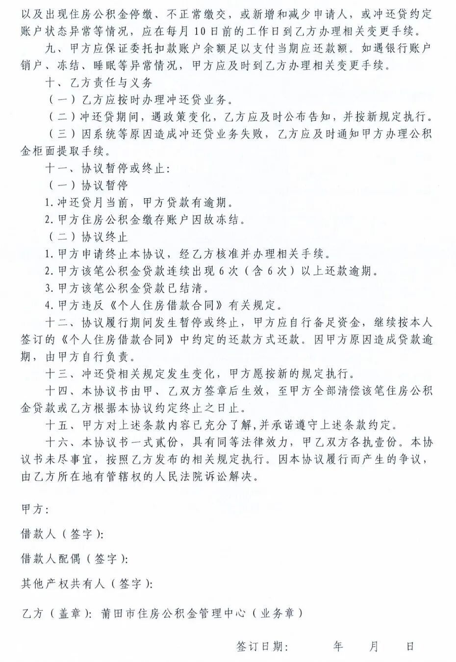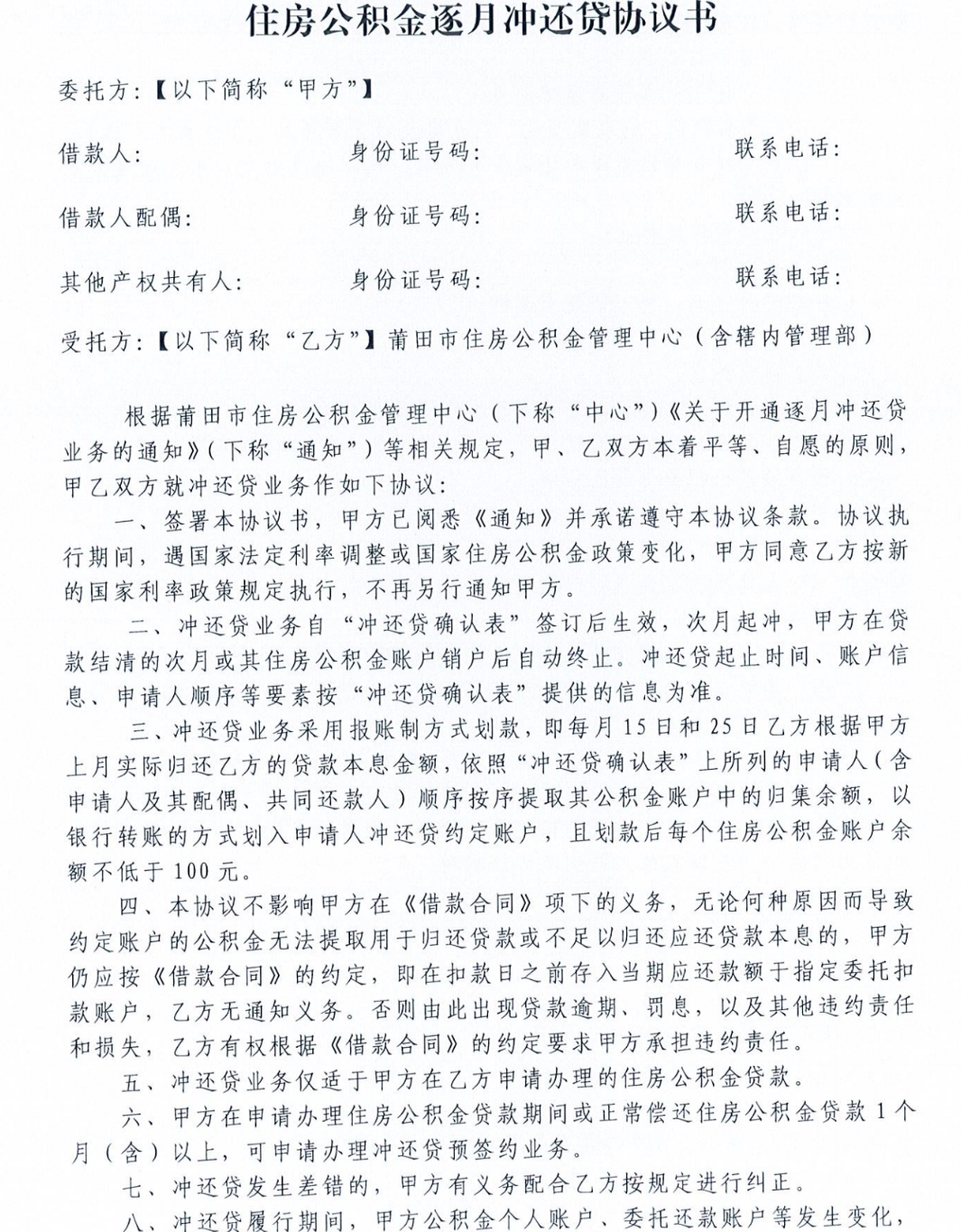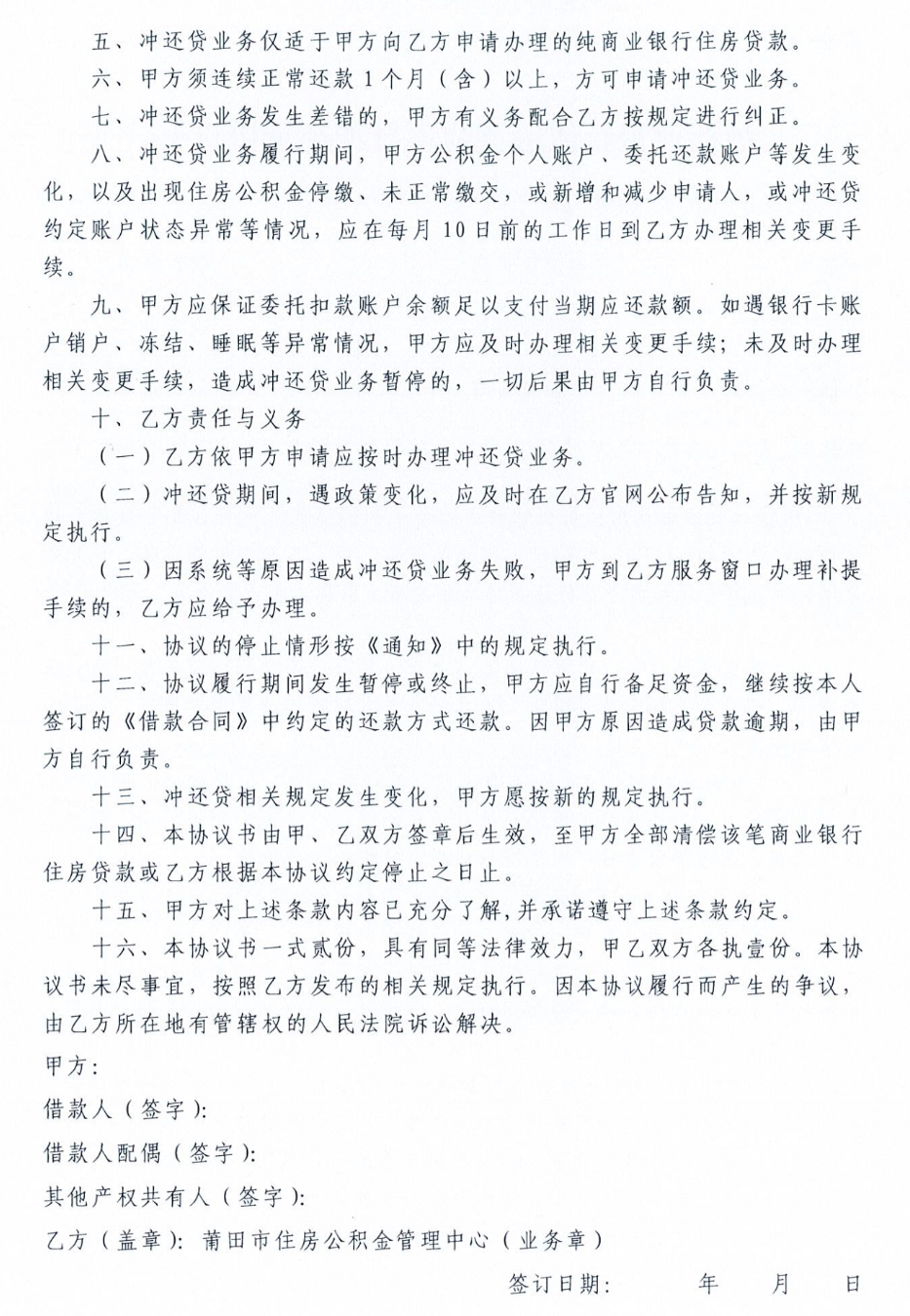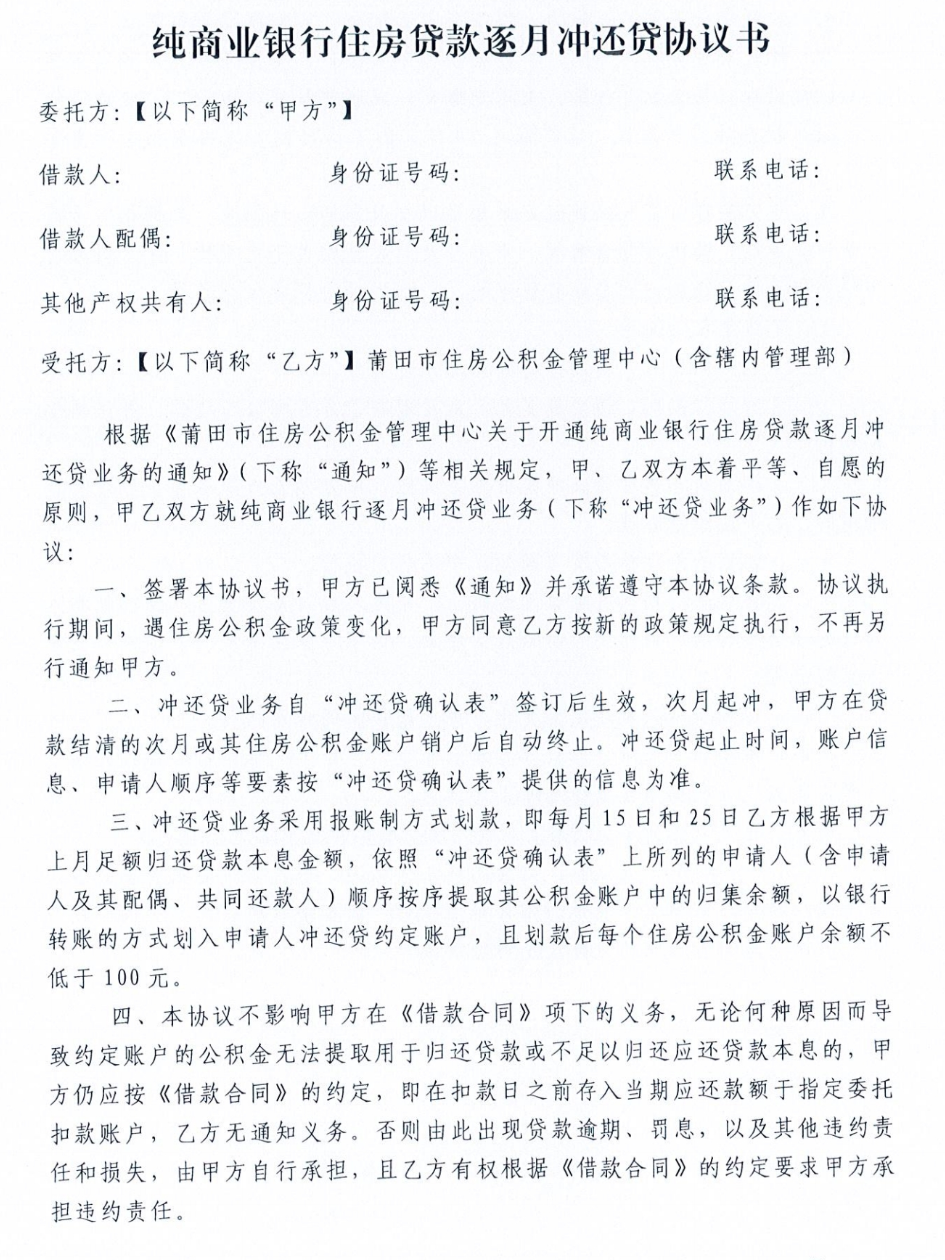 莆田市住房公积金“逐月冲还贷”业务 实行“一月两冲”模式 刚刚 莆田市住房公积金管理中心 发布通知 一起来看↓↓↓ 关于“逐月冲还贷”业务实行“一月两冲”模式的通知 各缴存职工: 为进一步提升服务质效,减轻职工还贷压力,经研究,决定对住房公积金贷款和纯商业银行住房贷款“逐月冲还贷”业务进行优化,增加每月划款频次,实施“一月二冲”划款模式。现将有关事项通知如下: 一、调整划款模式 将原每月15日单次划款的“一月一冲”模式,优化调整为每月15日、25日两次划款的“一月二冲”模式。该模式实施后,因15日当天个人公积金账户余额不足等原因导致划款失败的,系统将于25日自动发起补充划款。 二、业务实施规则 (一)“一月二冲”模式下,所有已签约住房公积金贷款和纯商业银行住房贷款“逐月冲还贷”业务的缴存职工将自动适用新划款机制,无需另行办理手续。 (二)《住房公积金逐月冲还贷协议书》《纯商业银行住房贷款逐月冲还贷协议书》相关条款同步更新,其余事项继续按现行规定执行。 三、本通知自印发之日起施行。国家、省及我市后续新出台的相关政策与本通知不一致的,按新规定执行。 附件:1.住房公积金逐月冲还贷协议书 2.纯商业银行住房贷款逐月冲还贷协议书 莆田市住房公积金管理中心 2026年4月20日 附件1: