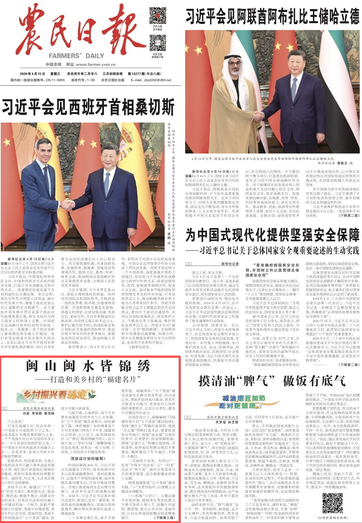 4月15日,《农民日报》头版刊发《闽山闽水皆锦绣》。详情如下——