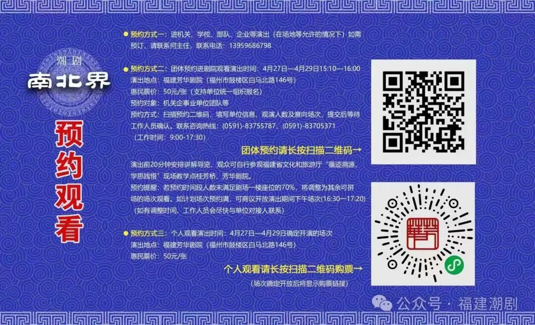 潮剧《南北界》 主办方供图 作为首批国家级非物质文化遗产,潮剧素有“南国奇葩”美誉,以“无丑不成戏”的行当特色尽显舞台灵动。本次献演的《南北界》,由云霄县潮剧传承保护中心创排演出,是我省“文艺倡廉”优秀舞台艺术作品展演省级剧目库重点作品,时长约50分钟。剧目屡获殊荣:荣获第九届福建艺术节暨第二十九届戏剧会演剧目奖(中型作品第一名),并成功入选第十届全国优秀小戏小品展演、获评优秀剧目,以小切口折射大主题、用老剧种讲好新故事。