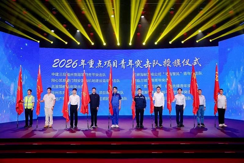 授旗仪式。主办方供图 活动现场,还为荣获福建青年五四奖章和福建新时代青年先锋的重点项目青年突击队集体及个人颁奖,并为2026年重点项目青年突击队代表授旗。全省各级团组织积极响应党的号召,团结带领广大青年聚焦福建省重点项目建设,组建了2000余支青年突击队,投身各项“急难险重新”任务,以实际行动彰显了新时代八闽青年风采。 |