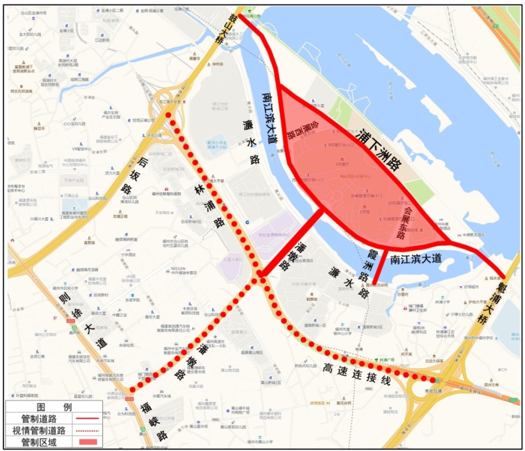 福州市公安局关于第九届数字中国建设峰会系列活动期间部分道路实行临时交通管制的通告 第九届数字中国建设峰会系列活动将于2026年4月29日至5月4日在我市海峡国际会展中心举行。为确保峰会期间我市道路交通安全畅通,根据《中华人民共和国道路交通安全法》第三十九条、《中华人民共和国人民警察法》第十五条等规定,决定对以下道路实行临时交通管制。现通告如下: 一、开幕式期间交通管制 2026年4月29日7:00至14:00,对南江滨大道(魁浦大桥桥下至鼓山大桥桥下)、浦下洲路(以上均含本路)组成的围合区域内道路,潘墩路(林浦路路口至南江滨大道路口)、霞洲路(南江滨路口至濂水路口)实行交通管制,禁止机动车(持专用通行证车辆以及周边单位、小区车辆除外)通行,禁止非机动车、行人(持专用证件人员除外)通行,地铁4号线会展中心站仅允许持专用证件人员出站。 同时,公安交通管理部门将根据道路交通流量实际情况,视情对林浦路(后坂路路口至潘墩路路口)、潘墩路(福峡路路口至林浦路路口)、高速连接线(潘墩路路口至秀宅互通)实行交通管制,禁止机动车(持专用通行证车辆、公交车、出租车以及周边单位、小区车辆除外)通行。
