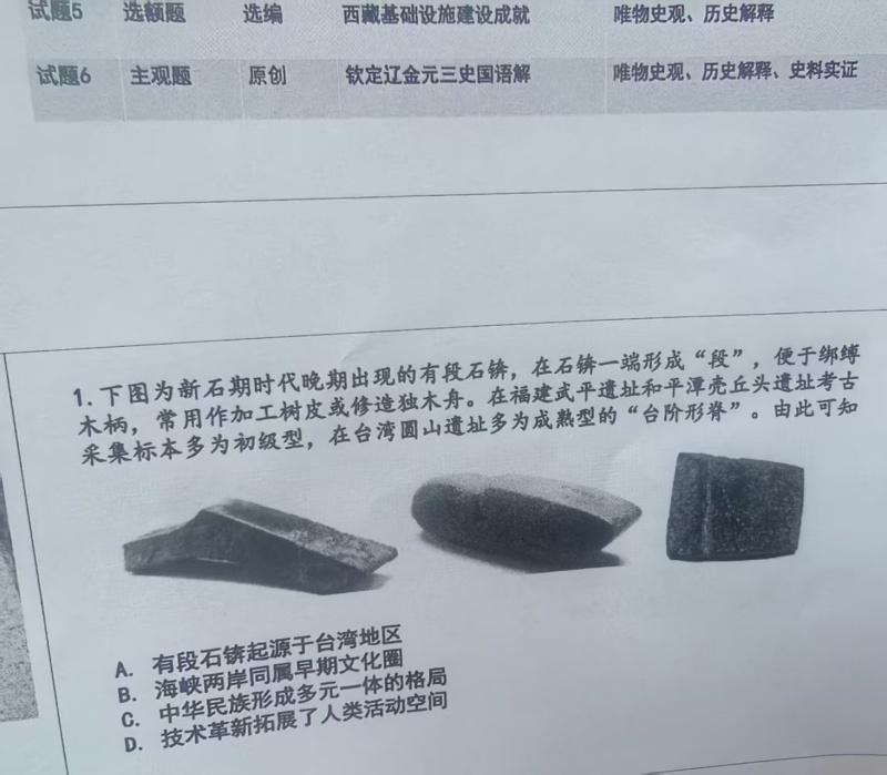 福建师范大学附属中学金磊老师题目联系学生生活实际 福建师范大学附属中学历史学科的金磊老师让题目“长”在了生活里。他笑称自己的灵感来自学校师生上周到平潭参加的一场南岛语族文化普及活动,设计了一道将南岛语族文化、海峡两岸共同文化圈串联起来的题目。“文科不能高高在上,”金磊强调,“当平潭的石锛与台湾的石锛在试题中‘对话’,学生探究的欲望就被点燃了。这道题不仅考知识,培养学生史料实证能力与历史解释能力,更在无声中渗透家国情怀,增强文化认同,筑牢中华民族共同体意识。”