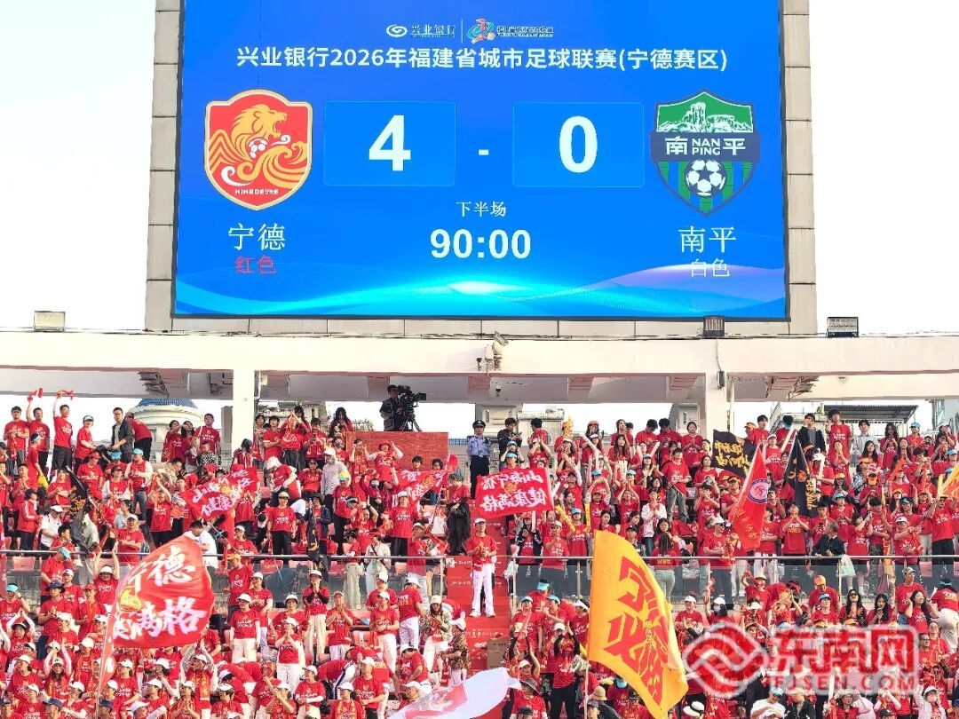 4月25日 2026年福建省城市足球联赛 宁德赛区首轮比赛 在宁德市体育中心盛大启幕 经过90分钟鏖战 宁德队以4:0胜南平队