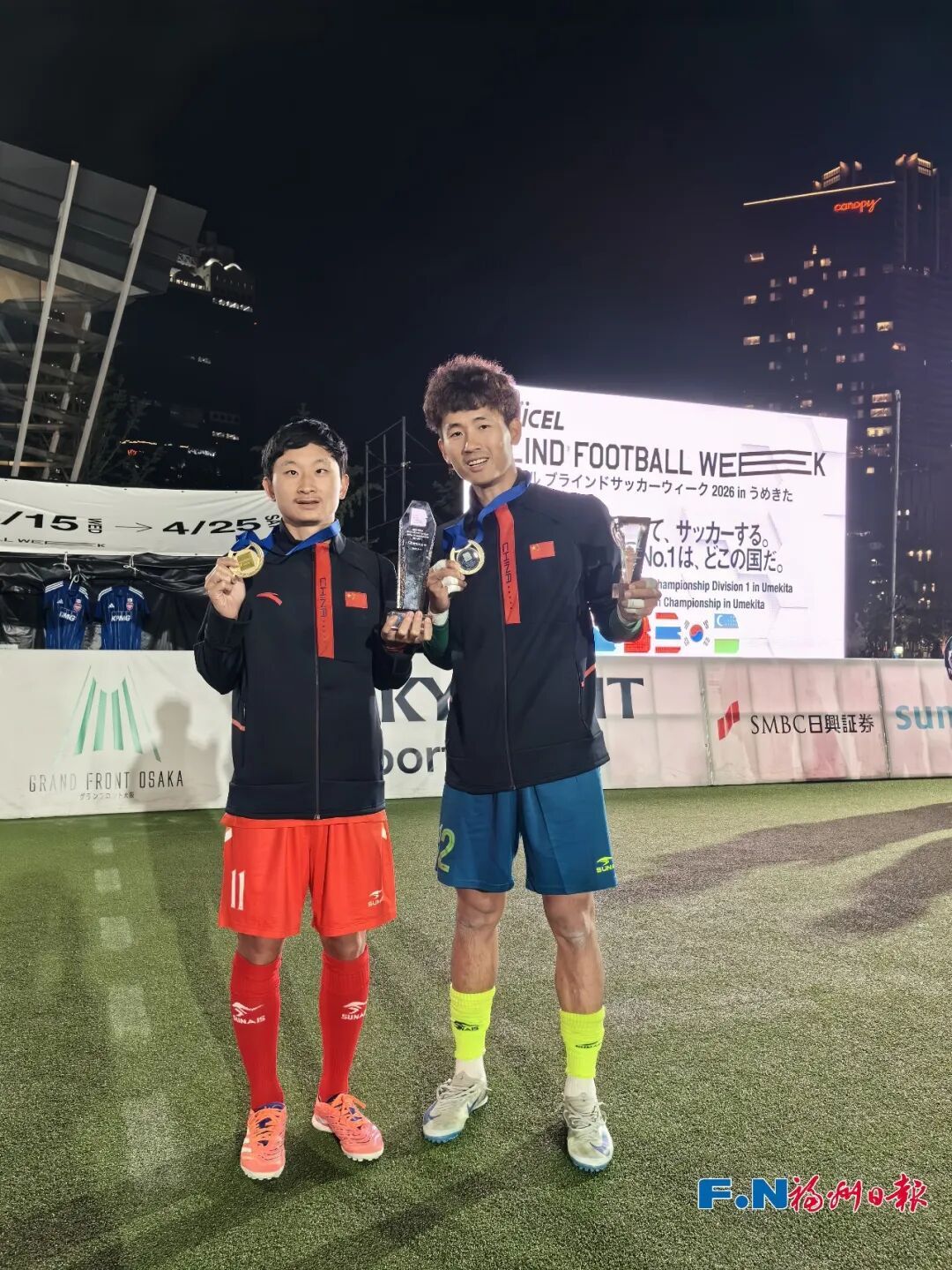 北京时间4月25日下午 在日本大阪举行的 2026年IBSA盲人足球亚锦赛决赛中 中国队1:0东道主日本队 以五战全胜、一球未失的完美战绩 成功夺得冠军! 这座金杯不仅代表着亚洲之巅 更意味着中国队一举拿下了 2028年美国洛杉矶残奥会的直通门票 据悉 中国队计划于4月26日回国 本场决赛面对实力强劲的日本队 双方陷入胶着 中国队凭借顽强的防守与默契的团队配合 抓住机会打入制胜一球 最终零封对手登顶 队内的运动员张家松在本次赛事中收获3个进球。赛后,培养自福州市盲校的他分享了夺冠喜悦:“能代表中国队站上最高领奖台,感觉像做梦一样。我知道有很多福州球迷在云端为我们加油。虽然看不见,但每次触球,我都能感受到那份从福州传递过来的力量。能从福州走向亚洲之巅,是我的骄傲。” 如果说张家松是刺向对手的“矛”,那么福州连江籍老将、门将许华楚,就是中国队最令人放心的“盾”。从小组赛到决赛,他所把守的球门一球未失,铸就了冠军坚实的基础,并荣膺本次赛事最佳门将。这位经验丰富的“定海神针”,用一次次不可思议的扑救,让对手绝望。