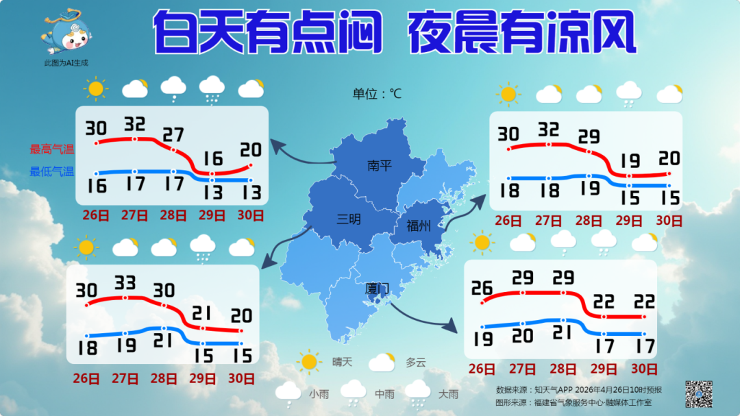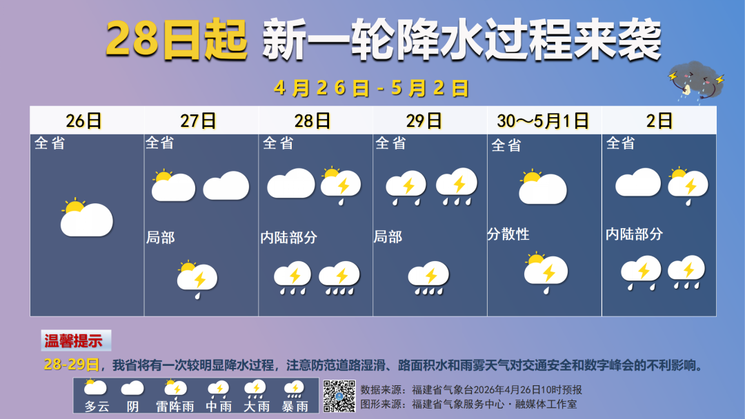 今天(26日)和明天 福建以多云天气为主 天气总体较好 适宜外出游玩以及洗衣晾晒等活动 28-29日 福建将有一次较明显降水过程 全省有中雨 西部北部地区部分有大雨到暴雨 其余地区局部有暴雨 雷雨时局部伴有强对流天气