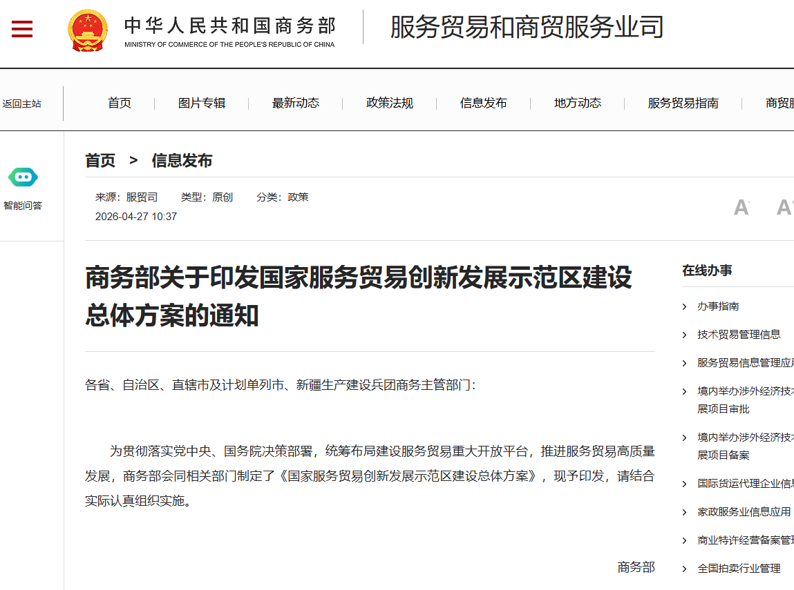 近日,商务部关于印发国家服务贸易创新发展示范区建设总体方案的通知,在北京、天津、上海、重庆、大连、厦门、青岛、深圳、南京、杭州、合肥、武汉、广州、成都、西安、苏州等16个城市和海南省率先开展示范区建设。