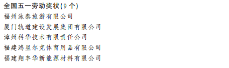 今天,全国总工会举行全国五一劳动奖表彰大会,表彰全国五一劳动奖3024个,其中,全国五一劳动奖状379个、全国五一劳动奖章1462名、全国工人先锋号1183个。 福建这些集体、个人在列 一起来看—— 全国五一劳动奖状(9个) (福建部分)