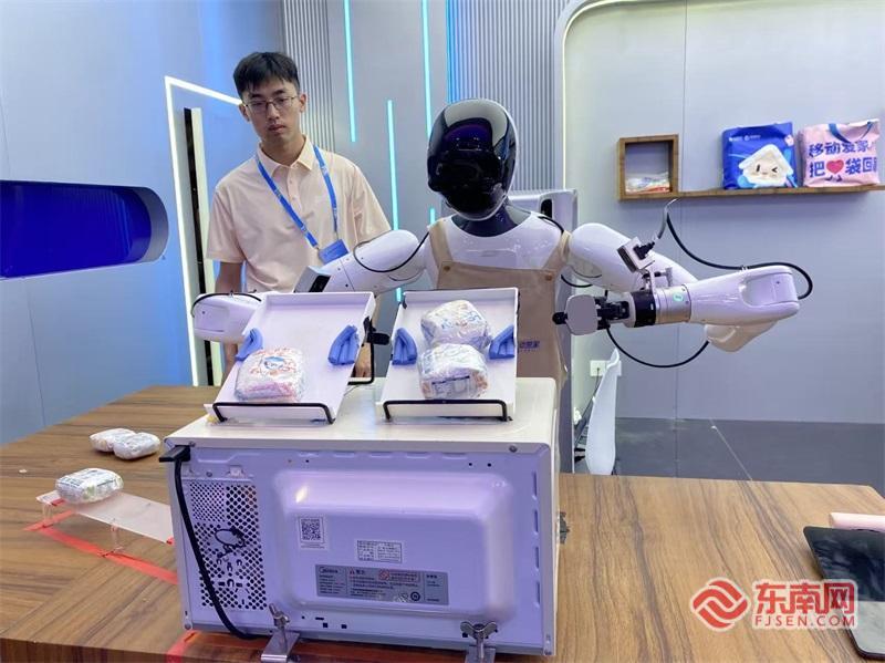 机器人在加热餐食。 中国移动展区推出的“移动星厨”场景,将硬核科技与烟火气巧妙融合。在自研5G-A CIS-RAN基站技术支撑下,咖啡机器人精准完成制咖流程,餐食加热机器人、跑堂机器人协同配合,为观众送上热乎美食,让未来生活场景触手可及。 “科技感太强了,能直观看到未来生活的样子。”福州市民郭女士体验后连连称赞。带着孩子前来参观的市民陈先生表示:“机器人既能做咖啡又能送餐,孩子看得特别入迷,这就是最生动的科技课。” 百项互动沉浸式体验 数字科技贴近民生