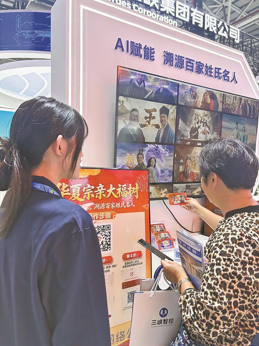 4月28日,众多市民和参展企业代表在网龙展区体验由AI、VR、AR等技术共同编织的数字奇境。图为市民输入姓氏与祖籍信息,AI随即生成一棵专属3D宗族“福树”,并与姓氏名人同框合影。福建日报记者 林蔚 摄 |