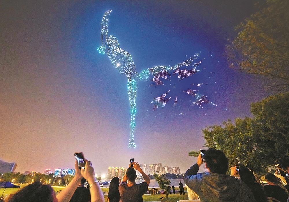 4月28日,福州市闽侯县旗山湖上空,3333架无人机编队演绎了一场数字中国建设峰会主题光影秀。 福建日报记者 施辰静 摄