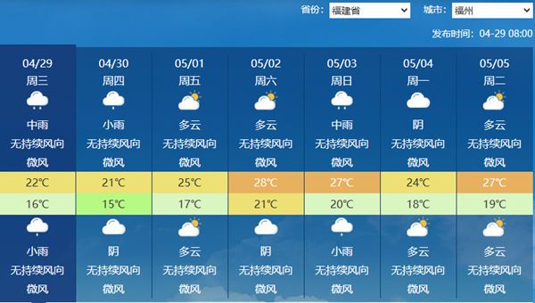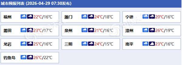 福建各地天气预报。(来源:中国天气网) 明天,福建降雨减少、减弱,全省多云到阴,部分地区有阵雨或雷阵雨。 后天五一假期正式开启,福建全省多云,有分散性阵雨或雷阵雨,天气整体适宜出行出游。