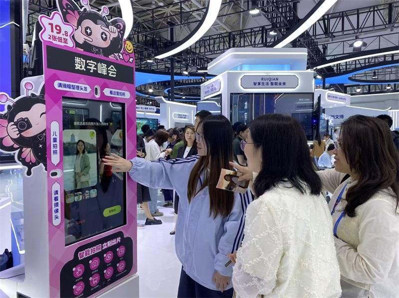 AI智能可视宠物项圈。 中国移动在峰会上首发了一款AI智能可视宠物项圈,吸引了养宠一族的围观。“它集定位追踪、视频监测、安全防护、双向通话于一体,不仅具备AI视频分析能力,还能实现专业宠物健康监测,实时关注宠物身体状态。”工作人员陈仕说,项圈让宠物户外活动轨迹可查,有效降低走失风险。产品将于今年5—6月在全国中国移动营业厅、移动爱家APP等渠道正式开售,为养宠家庭带来更智能的守护。 在福建帝视科技集团展区,“蝶影AI拍照一体机”前排起长队。游客只需站在镜头前,40秒内无需换装,就能生成融合福州三条簪、三坊七巷爱心树、平潭蓝眼泪、武夷山九曲溪等福建特色元素的文旅大片。