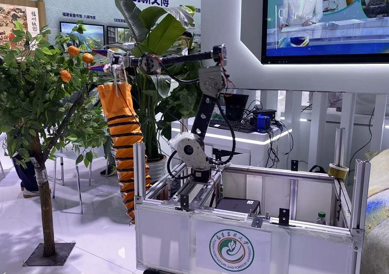 采摘机器人能精准识别树上果实。 在福建农林大学的展区里,一台“田间黑科技”同样引人注目:机器人精准识别树上果实,轻柔采摘后送入传送带与收集箱。 “机器人搭载视觉识别系统,可精准识别橘子、梨、桃子等圆状水果,通过自主计算坐标、规划路径,由柔性三角夹爪完成采摘,采摘后的水果将通过专属管道输送至收集装置。针对葡萄等簇状水果,还可灵活更换夹爪适配。”福建农林大学人工智能研究院教师柳诗涵介绍,机器人采用履带式底盘,能轻松应对山地丘陵路况,更贴合南方果园作业需求。 “目前设备已在福清果园试用,未来将推广到更多果园和温室农场。”柳诗涵表示,团队将持续优化性能,推动技术成果转化,让更多“福建造”智能装备扎根田间地头,为福建特色农业高质量发展注入数字动能。 点亮民生场景,数字赋能美好生活