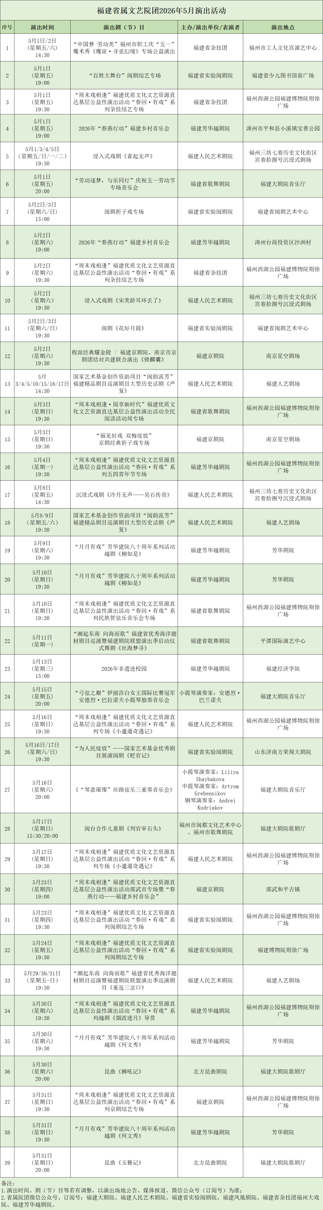 2026年省委和省政府为民办实事项目——“周末戏相逢”福建优质文化文艺资源直达基层公益性演出活动 “春回·有戏”系列 杂技综艺专场 时间: 5月1日19:30 地点: 福州西湖公园福建博物院则徐广场 演出单位: 福建省杂技团 杂技综艺专场 时间: 5月2日19:30 地点: 福州西湖公园福建博物院则徐广场 演出单位: 福建省杂技团 “五一”黄金周专场 时间: 5月3日19:30 地点 : 福州西湖公园福建博物院则徐广场 演出单位: 福建省歌舞剧院 五四青年节专场 时间: 5月4日19:30 地点: 福州西湖公园福建博物院则徐广场 演出单位: 福建芳华越剧院 民族管弦乐音乐会专场 时间: 5月10日19:30 地点: 福州西湖公园福建博物院则徐广场 演出单位: 福建省歌舞剧院 儿童剧专场《小邋遢奇遇记》 时间: 5月16日19:30 地 点: 福州西湖公园福建博物院则徐广场 演出单位: 福建人民艺术剧院 儿童剧专场《小邋遢奇遇记》 时间: 5月17日19:30 地点: 福州西湖公园福建博物院则徐广场 演出单位: 福建人民艺术剧院 闽剧综艺专场 时间: 5月23日19:30 地点: 福州西湖公园福建博物院则徐广场 演出单位: 福建省实验闽剧院 闽剧综艺专场 时间: 5月24日19:30 地点: 福州西湖公园福建博物院则徐广场 演出单位: 福建省实验闽剧院 越剧《烟波迷月》导赏 时间: 5月30日19:30 地点: 福州西湖公园福建博物院则徐广场 演出单位: 福建芳华越剧院 京剧综艺专场 时间: 5月31日19:30 地点: 福州西湖公园福建博物院则徐广场 演出单位 : 福建京剧院