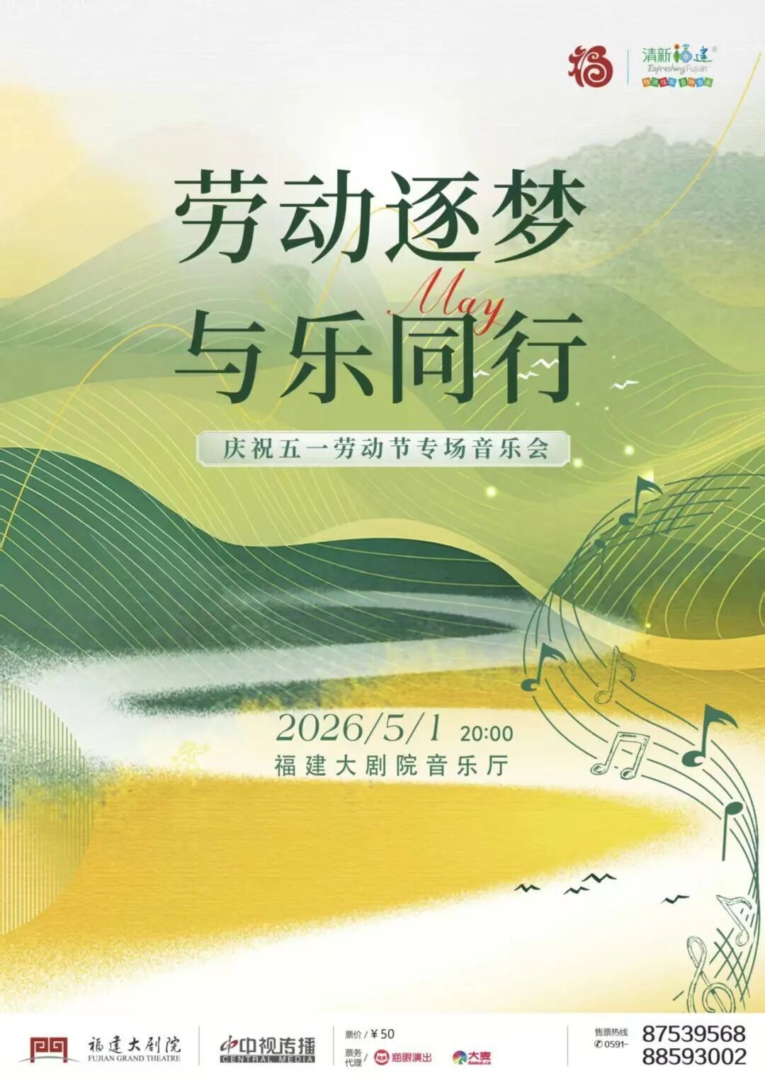 “劳动逐梦,与乐同行”庆祝五一劳动节专场音乐会 时间: 5月1日 20:00 地点: 福建大剧院音乐厅 演出单位: 福建省歌舞剧院