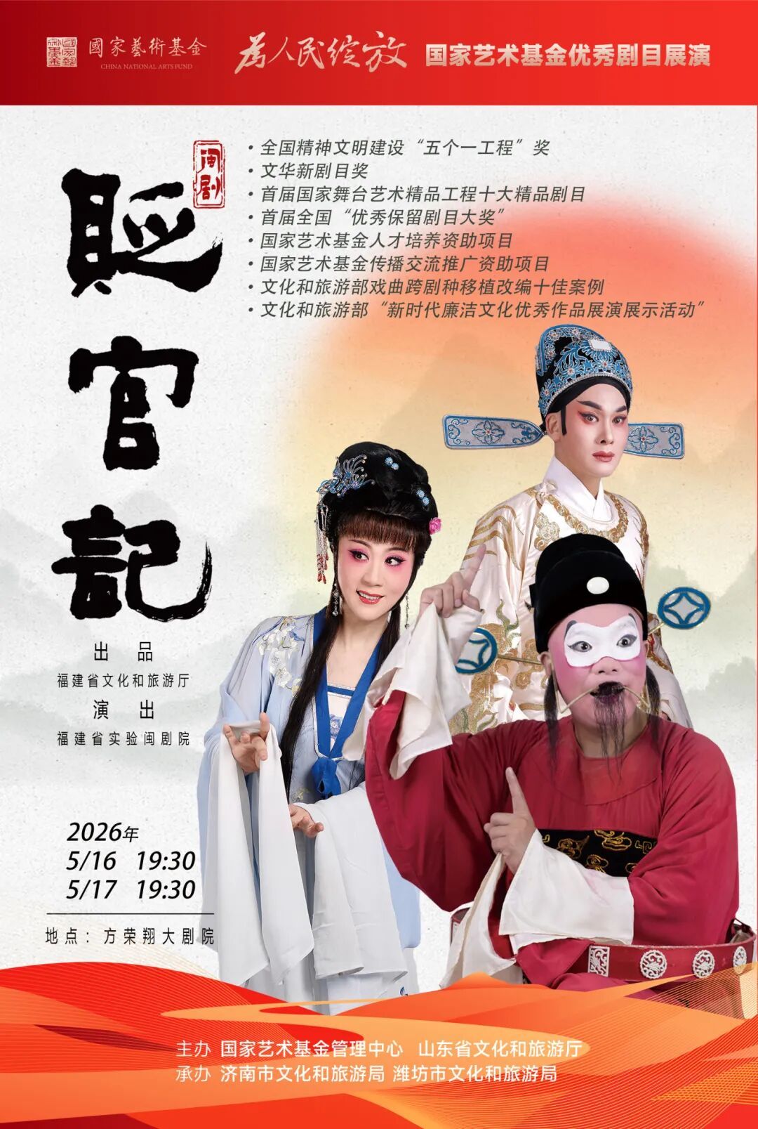 “为人民绽放”——国家艺术基金优秀剧目展演闽剧《贬官记》 时间: 5月16/17日 19:30 地点: 山东济南方荣翔大剧院 演出单位: 福建省实验闽剧院 新·国风舞剧《翎衣》 时间: 5月16日 15:30/20:00 地点: 福州·海峡文化艺术中心 歌剧院 票价: 880/680/480/380/280/180/100元 购票渠道: “福州海峡文化艺术中心”微信公众号 儿童剧《判官审石头》 时间: 5月17日 15:30/20:00 地点: 福建大剧院歌剧厅 演出单位: 福州市闽都文化艺术中心(福州市歌舞剧院)