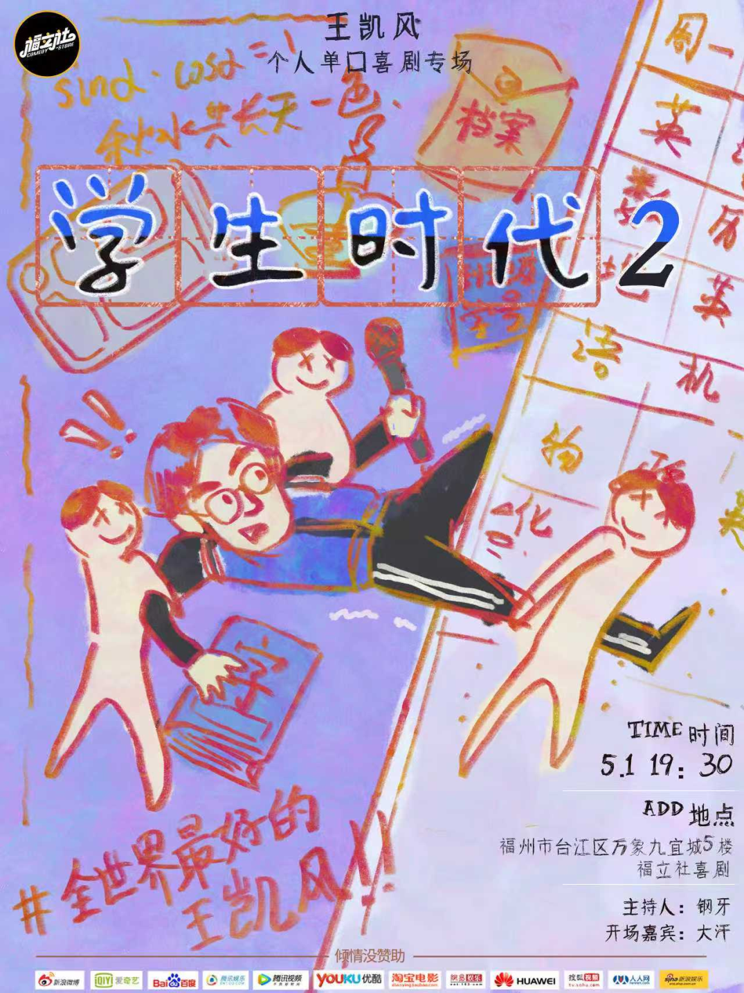福立社喜剧《我的学生时代2.0》王凯风个人脱口秀专场 时间: 5月1日 19:30 地点: 万象九宜城福立社喜剧 票价: 120/150元 购票渠道: “福立社喜剧”微信公众号 福立社喜剧《出关》赵聪明个人单口喜剧专场 时间: 5月4日 19:30 地点: 万象九宜城福立社喜剧 票价: 120/150元 购票渠道: “福立社喜剧”微信公众号 福立社喜剧《眉事》刘骙个人单口专场 时间: 5月9日 19:30 地点: 万象九宜城福立社喜剧 票价: 120/150元 购票渠道: “福立社喜剧”微信公众号 福立社喜剧《我打不赢爱情》贤鱼个人专场 时间: 5月16日 19:30 地点: 万象九宜城福立社喜剧 票价: 120/150元 购票渠道: “福立社喜剧”微信公众号 福立社喜剧《小大人》吴星辰个人专场 时间: 5月19日 19:30 地点: 万象九宜城福立社喜剧 票价: 168元 购票渠道: “福立社喜剧”微信公众号