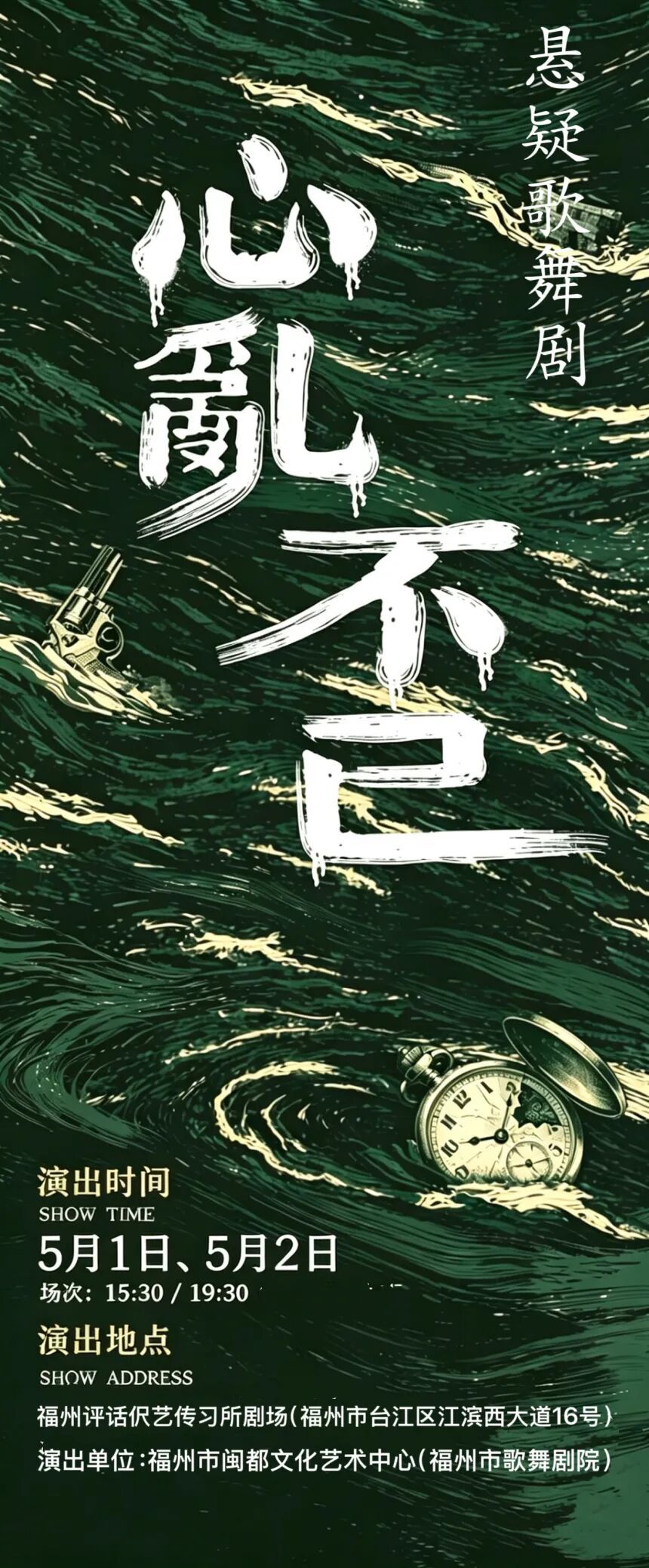 悬疑歌舞剧《心乱不已》 时间: 5月1/2日 15:30/19:30 地点: 福州评话伬艺传习所剧场 二楼演出厅 演出单位: 福州市闽都文化艺术中心