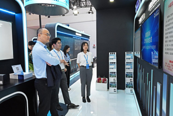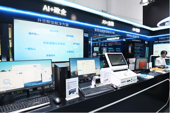 参展展品 傅心婕 摄 星网锐捷展示了全栈国产算力一体机,深度整合国产化芯片、操作系统及AI算法模型,可高效支持十亿至千亿级大模型本地化部署;其轻量化算力小盒灵活嵌入边缘终端场景,提供稳定高效的边缘AI推理算力。旗下升腾资讯联合华为推出“升华”系列信创终端与服务器,其中信创台式机整机国产化率超99%,升华服务器采用鲲鹏920处理器与AI加速卡,适用于办公、存储、云计算等场景。 云计算展示了两大核心算力成果。高标准IDC数据中心,具备定制化与物理隔离能力,可提供1.35万个机柜,灵活适配通算、超算、智算等多源异构算力场景;同时支持冷板式和浸没式液冷高功率机柜改造,兼容国内外主流智算设备,可支撑4000P算力部署。全栈信创云平台实现异构资源统一纳管调度,构建覆盖云资源供给、等保合规、密码引用及安全测评的全链路信创云服务体系。智能计算平台则以“超算+智算”双轮驱动,赋能科学计算与AI场景应用,激活数字产业创新动能。
