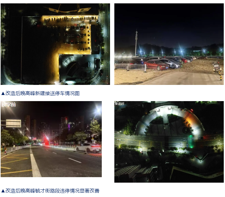 泉州交警立足“安全保障、接送有序”治理目标,推行“挖掘停位、优化组织、加强管控、警校合力”多维整理模式,通过加高道路隔离护栏、增设机非隔离设施、新增3处绿波协调信号灯,清晰划分人车路权,有效减少交通冲突。同时,在学校路段引入“5分钟临停接送”模式,增设即停即走限时抓拍设备,推动接送车辆即停即走、快速通行。 当地积极盘活学校周边闲置用地,开辟600个停车泊位,打造两处临时接送停车场,并推出2小时免费停车惠民政策,有效分流路面停车压力。依托家校APP深化警校联动,创新双模式错峰接送机制,精准匹配停车空间与接送时段,分散车流和人流。治理后,路段车辆占道时长、通行耗时进一步降低,路口通行服务等级显著提升,校园周边交通乱象与噪声污染进一步减少,全面筑牢师生通学环境。