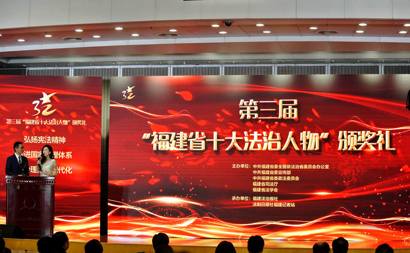 颁奖仪式现场。东南网记者 林先昌 摄 东南网12月6日讯(本网记者 林先昌)在第二个国家宪法宣传周活动中,12月6日下午,以“践行法治思想、彰显法治力量”为主题的第三届“福建省十大法治人物”颁奖礼在福建会堂举行。 省政府副省长、省公安厅党委书记、厅长田湘利,省政协副主席杜源生,省高级人民法院党组书记、院长吴偕林,省人民检察院党组书记、检察长霍敏出席颁奖礼,省委依法治省办副主任、省委政法委常务副书记、省法学会党组书记王敏夫为颁奖礼致辞。“十大法治人物”评选活动组委会成员,部分获奖者所在设区市政法委、工作单位负责人等参加了此次活动。 现场为10名第三届“福建省十大法治人物”获奖者和10位提名奖获得者颁奖。 第三届“福建省十大法治人物”分别是:中共福建省委政法委员会执法监督室二级主任科员康志纯、福建省高级人民法院生态环境审判庭副庭长秦传熙、厦门市人民检察院第四检察部主任戴静、福州市公安局鼓楼刑侦大队副大队长陈明月、厦门市公安局湖里分局法制队队长刘敏玲、明溪县司法局城关司法所所长方秋轩、福建师范大学法学院院长林旭霞、莆田市妇女维权法律服务中心主任徐素瑜、三明市公安局白沙派出所(集体)、福建省未成年犯管教所教育科(集体)。 10位提名奖获得者分别是:福建省人大常委会法制工作委员会法规二处处长吴黎静、南平市延平区法院审判委员会专职委员及刑事审判庭庭长郑世文、泉州市检察机关“刺桐花”团队(集体)、平潭综合实验区公安局治安巡特警支队民警林学就、福建融成律师事务所副主任陈少海、福州大学法学院院长黄辉、霞浦县三沙商会“黄光清调解工作室”调解员黄光清、云霄县委办退休干部张铁城、福清市消防救援大队(集体)、厦门出入境边防检查总站福州出入境边防检查站执勤三队(集体)。 据介绍,第三届“福建省十大法治人物”评选活动由福建省委全面依法治省办公室、省委宣传部、省委政法委、省司法厅、省法学会主办,福建法治报社、法制日报社福建记者站承办。评选活动共推荐了60名候选人。经过初评、媒体宣传、公众投票,并经评审组评委们严格评审,选出了事迹突出、群众认可的“十大法治人物”和10位提名奖获得者。评选活动引起了社会的广泛关注,在全社会进一步营造了争做中国特色社会主义法治的忠实崇尚者、自觉遵守者、坚定捍卫者的浓厚氛围。