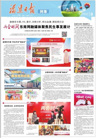 2020年1月14日福建日报网事版(9版)主要稿件: 融媒体专题、H5、漫评、词频分析、移动直播、微视频访谈 两会时间 东南网融媒体聚焦民生事发展计