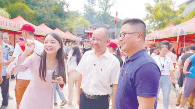 中共南平市建阳区委常委、宣传部长刘寒(中)在考亭古街的古建筑长乐坊中,向网友介绍建筑的特色之处。