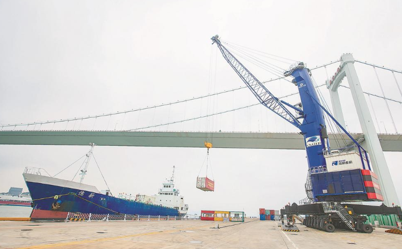 东南网5月1日讯(福建日报记者 施辰静)4月29日,台轮“亿薪”载着一批来自台湾的生鲜产品靠抵厦门国际邮轮中心码头,至此,该码头“小三通”业务转移正式拉开序幕。图为厦门港目前最大的流动式起重设备对此次货物进行装卸。