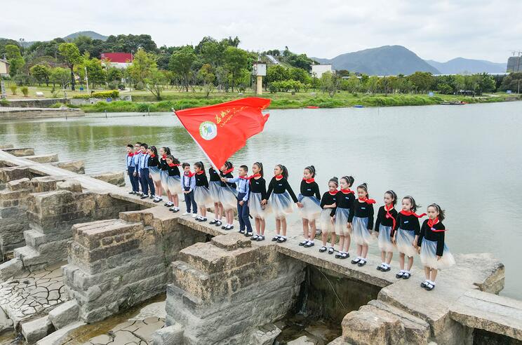 莆田市荔城区新度中心小学学生到木兰陂游览。木兰溪上这条长200多米、形同钢琴的古堰建成于1083年,被列入首批世界灌溉工程遗产名录。它是全国保存最完整的古代水利工程之一,堪称福建的“都江堰”。福建日报记者 吴鹏 通讯员 詹兴妹 谢海涵 摄