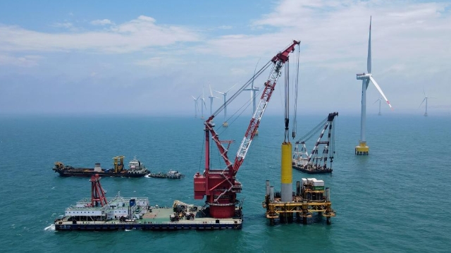 这是莆田平海湾海上风电场项目施工现场(5月21日摄)。 5月21日,一根直径6.7米的嵌岩单桩在福建省莆田南日岛西南侧海域成功植入海底。至此,由福能集团三川海上风电有限公司开发建设,中交一航局负责施工的29台单机容量7兆瓦风机(含6台嵌岩单桩基础型式、23台高桩承台基础型式)植桩全部完成,取得工程重要节点突破。新华社记者 魏培全 摄