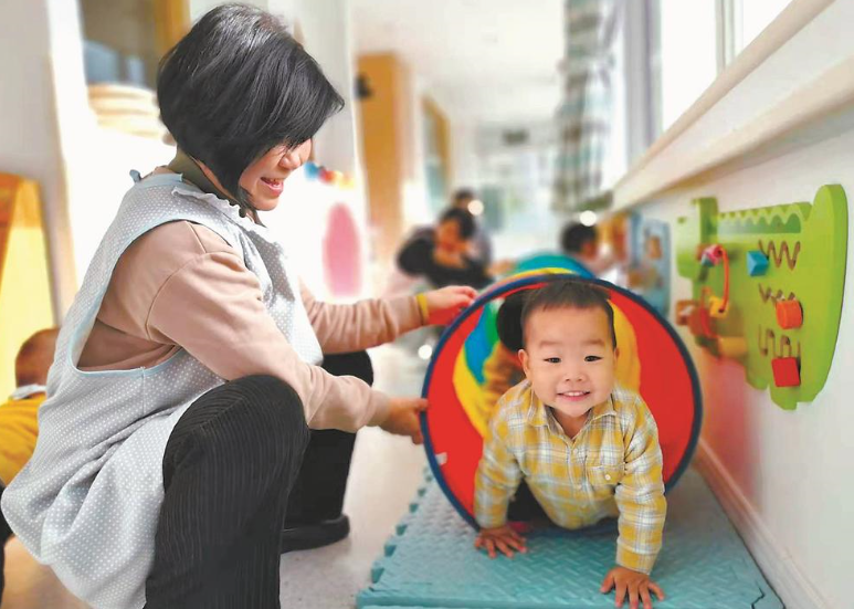 托小班的孩子在生活老师的帮助下进行室内运动。 东南网12月16日(福建日报记者 张静雯 储白珊 文/图)“乐乐,跟爸爸再见,要乖乖听老师的话。”9日上午8时,家住福州市鼓楼区东街街道的陈锋准时把2岁多的孩子送到了福建省国资教育托育园(东街园),看着孩子熟练地换好室内鞋进入活动室,随后安心地离开了。 陈锋告诉记者,自己和爱人都是上班族,孩子出生后一直由爷爷奶奶照看。前些日子,老人身体不好,回老家休养了,谁来带孩子就成了大问题。“幸运的是,家附近开办了普惠性托育园,有专业的教师团队负责孩子的学习生活,每天把孩子送到园里,我们就可以安心工作了。” 为了让更多家庭拥有这份安心,2020年起,我省连续两年把婴幼儿照护服务试点列入省委省政府为民办实事项目,探索普惠性托育,为千家万户提供了带娃新选择。 “家门口有了普惠托育中心,真是太好了!” 和爸爸告别后,乐乐就开启了托育园里的欢乐时光。一看到好朋友菲菲在活动室里滑滑梯,他就撒开步子跑进了活动室。在老师的邀请下,他火速加入了游戏队伍。 8时20分许,当日入园的小朋友都到齐了,大家在老师的带领下回到各自的教室内,开启当天的区域活动时间。 走进乐乐所在的海绵宝宝班,20名2~3岁的小朋友分成3组,在2名老师和1名保育老师的带领下,进行区域游戏。 “宝宝们,还记得小螃蟹怎么走路吗?”老师蓝兰向孩子们温柔地提问道。话音一落,组内的两名小朋友立刻举起小手,用拇指和食指捏住耳垂轻轻下拉,就像两只可爱的小螃蟹。 “对了,对了,宝宝真棒!”蓝兰笑着对孩子们进行了表扬。随后,她耐心地鼓励孩子们模仿同伴和自己的动作,让每一只“小螃蟹”都开心地“走”起来。 “简单易学的动作,却能给孩子们带来很多帮助。”蓝兰介绍,这个练习不仅可以锻炼孩子们的精细动作,还能按摩穴位,实现健脾和胃、镇静安神的效果。 “像这样的区域活动特色课程,我们每周都会根据孩子阶段性的身心特点精细设计。”园长孙彦彦举例说,即便同是2~3岁的托大班孩子,我们也会根据孩子的年龄情况再细分,灵活安排教学模块。更多的耐心,更细致的看护,寓教于乐,才能让孩子们获得全面的发展。 和同伴在一起的时间总是过得飞快。9时20分,园内的孩子们迎来了点心时间。排队洗好手,他们坐在自己的位置上,一手扶着装牛奶的口杯,一手拿着奶香馒头,有模有样地吃了起来。吃完后,他们自觉地把自己的餐盘、餐具、毛巾分类放置到指定区域后,才加入到散步消食的队伍之中。 “孩子在托育园的进步,我们每天都能感受到。”陈锋说,原本任性又内向的孩子在园内交到了不少好朋友,性格开朗了许多,不仅变得会表达、懂礼貌,还能够自己吃饭、睡觉、洗手、穿鞋……养成了良好的生活习惯。 “我相信,自己的选择是对的。”陈锋说,孩子成长需要专业的培养,专业的托育机构可以提供科学的照护,更有利于婴幼儿身体、心理、智力等方面的健康发育。 “家门口有了普惠托育中心,真是太好了!”看到邻居家孩子的变化,“90后”宝妈王芳芳也想把1岁半的孩子在明年春季学期送到托育园。 专业化规范化,提升托育行业服务质量 走进位于厦门湖里区的省级普惠托育示范机构、馨贝昉托育中心,马上就有一种闯入“小人国”的感觉。 整洁明亮的室内,鞋柜、沙发、桌椅等家具,甚至是洗手池、马桶等盥洗设施,都是“迷你”的。在其中,孩子们可以轻松自如地体验各种生活场景。 “园内的所有硬件都是按照0~3岁孩子的身高和使用习惯量身打造的。”该中心负责人林海微介绍说,除了用心打造设施设备外,中心严格执行卫健部门的有关规定,根据入托幼儿的月龄,设置乳儿班、托小班、托大班三种班型,以乳儿班1∶3、托小班1∶5、托大班1∶7的师生比配置教师,并安排保育员,让孩子在园内的生活得到更好的照料。 为了有更多规范的普惠性托育机构能够为千家万户解决带娃难题,去年底,省卫健委发布了《福建省托育机构设置标准》和《福建省托育机构管理规范实施办法》,对托育机构的场地要求、硬件设施、医护条件、师生比例、机构规模等方面作出了详细的规定,引导托育机构往专业化、规范化方向发展。 “有了这两份指导意见,托育机构的硬件设置就容易规范起来了。但是在服务方式和课程内容等软件方面,目前各地还没有统一的规范,各家机构还处在各自摸索的起步阶段。”资深幼教专家、国资教育托育园顾问郑琼表示。 郑琼认为,托育园绝不是幼儿园的下沉或照搬,不能使用幼儿园教材,也不能照搬国外教材,因此“如何托”“怎么育”“教什么”值得从业人员进行深入的思考和探索。 作为首批省级普惠托育示范点,福建省国资教育托育园走在了同行前列,开启自创教材之路。办园之初,国资教育产研中心就联合北京师范大学学前教育研究所所长洪秀敏教授、福建师范大学学前教育系主任吴荔红教授团队、福建省中医药大学林丽莉教授和林栋教授团队编写《1.5~3岁医育融合托育课程教师用书》,并进行相应课程研发。 据悉,该课程体系将中医体质调理与早期教养相融合,根据婴幼儿的年龄,研发出了操作与体验、生活与习惯、运动与游戏三大特色模块课程,涵盖了国家卫生健康委《托育机构保育指导大纲(试行)》的七大领域。目前,已在福建省国资教育托育园四个园区