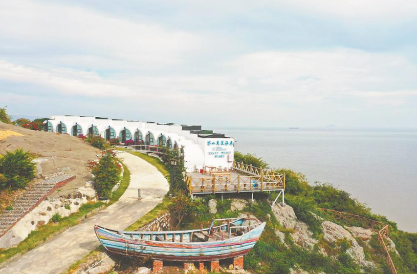 一家形似酒桶的特色旅店矗立海岸上。这两年来,越来越多的优质民宿和旅店落地,让嵛山岛的旅游接待能力大为提升。
