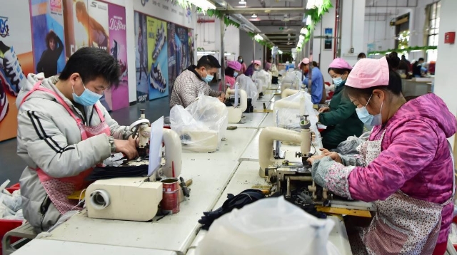 在一家鞋企生产线上,工人在使用新设备生产出口欧美的鞋面部件(2月25日摄)。