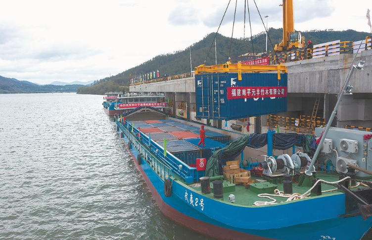 12月17日下午,“武夷2号”新能源船停靠南平港延平新城港区洋坑码头11号泊位,工人将集装箱吊装上船。 东南网12月23日讯(福建日报记者 王毅 通讯员 陈勤思 文/图)12月18日,在位于闽江上游的南平港延平新城港区洋坑码头11号泊位,随着“武夷2号”的一声悠长汽笛声响起,福建集装箱江海联运的序幕拉开,沉寂20多年的闽江“黄金水道”就此全面复航。 当日启航的500吨级新能源货运船“武夷2号”,是我省首艘自主设计建造的内河增程式电动货船,它载运着南平企业生产的竹制品、石英砂等货物,驶往福州马尾港。这些货物集装箱在马尾青洲码头换乘海船,再通过内外贸航线运往国内沿海城市及东南亚等地。此次通航不仅标志着南平港正式开港,也标志着闽江高等级航道正式通航。 闽江是福建最大的河流,自古就是山海相连、交易繁忙的“黄金水道”。长期以来,闽江航道靠自然水流,上游礁石密布,丰水期最大通航船舶只有50吨,每年9月至次年3月枯水期间,常出现断航现象,年货运总量仅为20万~30万吨。20世纪90年代,闽江干流上建成华东地区最大的常规水力发电站——水口水电站,水口水库上游回水100公里以上,大大改善了闽江干流航道的通航条件。然而进入新世纪以来,受河床水位下切、水文条件变化等因素影响,闽江航运处于断航状态。 2015年,投资27.18亿元的福建闽江水口水电站枢纽坝下水位治理与通航改善工程建设启动。2021年10月28日,闽江水口坝下工程一线船闸(现命名为“北溪船闸”)成功试通航,标志着由“两闸一机”(北溪船闸、水口船闸、水口升船机)组成的闽江水口航运枢纽正式投用。闽江水口航运枢纽实现从最低年通航44天到365天全天候通航的跃升,为闽江干流全线通航奠定了基础。 青山掩映,绿水凌波,“武夷2号”劈波斩浪一路驶向出海口的同时,规划形成5个港区、3个搜救中心和23个客运港点,货运通过能力2665万吨的南平港建设正如火如荼。洋坑码头11号泊位是南平港延平新城港区第一个正式投用的泊位,也是全省内河首个获批投产的500吨级多用途泊位。南平港开港运营,500吨级货船可从南平直达闽江口,货物经由闽江口内、外贸码头销往全国各地和全球。 闽江“黄金水道”将创“黄金效益”!据测算,水路运输的投资成本仅相当于公路运输的1/15,运输成本是公路的3/5、铁路的3/4。巨大的成本优势缩小了闽北内陆与沿海物流成本的差异。 闽江干流复航和南平港开港,是省委省政府全面振兴闽江内河航运、加快构筑多式联运现代综合交通运输体系的具体行动,也是南平主动融入福州都市圈、闽东北协同发展战略的重要举措。 由此,南平开启了“通江达海”的新时代。