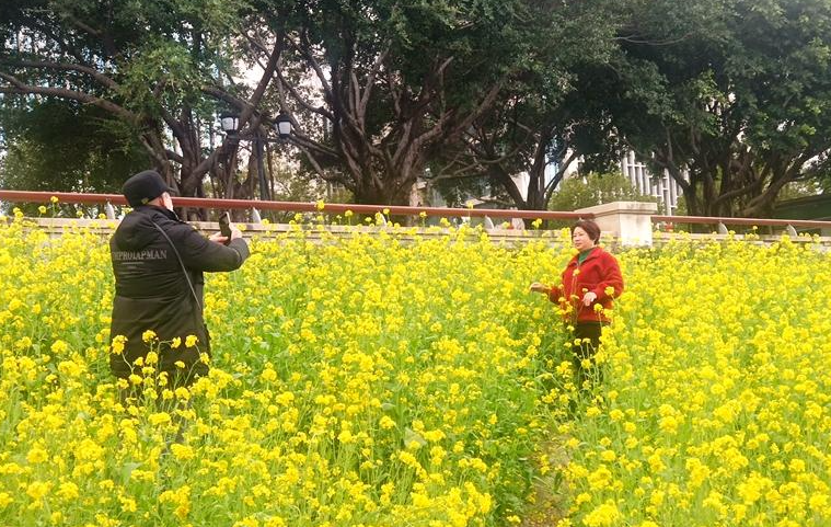 市民在福州花海公园盛开的油菜花前拍照。东南网记者 林先昌摄 东南网2月7日讯(本网记者 林先昌)草长莺飞,春暖花开,福州花海公园的油菜花迎来盛开期,油菜花竞相开放,流金溢彩,吸引不少市民前来赏花、拍照。据介绍,油菜花花期约有一个月,3月之前,市民都可来观赏金灿灿的花海。 油菜花茎绿花黄,花期1-3月,总状花序,花冠四瓣,呈十字形;长角果,到夏季成熟时开裂散出紫黑色种子。油菜进入开花季节,田间一片金黄,油菜花竞相怒放,花粉中含有丰富的花蜜,引来彩蝶与蜜蜂飞舞花丛间。 漫步福州花海公园,还可看到,山樱花花期2-3月,花粉红色,伞形花序,先叶开放,钟形花冠,成族下垂。枝叶繁茂旺盛,早春着花,色鲜艳亮丽,盛开时节花繁艳丽,满树烂漫,如云似霞,极为壮观;三五成丛点缀于绿地形成锦团,在花海公园内,形成“万绿丛中一点红”之画意。 福州花海公园的油菜花迎来盛开期。东南网记者 林先昌摄