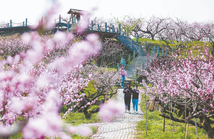 16日,在建宁县溪口镇枫元村上庄家庭农场,3000余株桃花竞相绽放,微风吹来,暗香浮动,游客们纷纷拿出手机拍照合影。