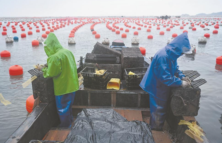 近日,在连江县下宫镇松芦湾海域,养殖户把鲍鱼苗投放进鲍鱼笼中。连江县被誉为“中国鲍鱼之乡”,下宫镇松芦湾海域是该县鲍鱼主产区,占全县鲍鱼总产量的40%。每年清明节前后是松芦湾海域养殖户的鲍鱼投苗季。周义 摄