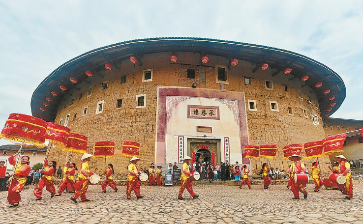 今年“五一”小长假,福建土楼永定景区迎来游客高峰。截至5月1日,永定土楼景区游客量超过15万人次,单日游客量最高突破6万人次。图为1日,承启楼前的大鼓凉伞表演吸引了游客驻足欣赏。福建日报记者 张杰通讯员 熊川 汤浩宇 摄