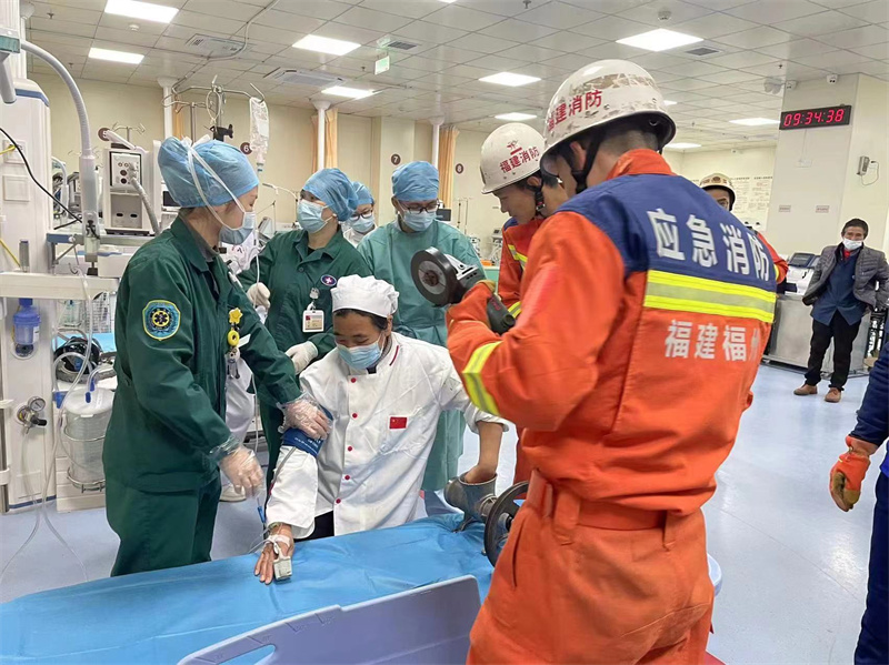 一名工人手被绞进了绞肉机送到医院急救。福州市二医院的陈燕、蔡梦、汤怀永护士镇定冷静地协助消防员成功完成急救。(福州市二医院供图)
