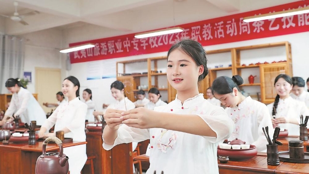 武夷山旅游职业中专学校日前举办“职业教育活动周暨首届非遗文化节”,通过制茶职业能手竞赛、茶艺竞赛等活动,让学生自觉传承非遗技艺,弘扬工匠精神。邱汝泉 摄