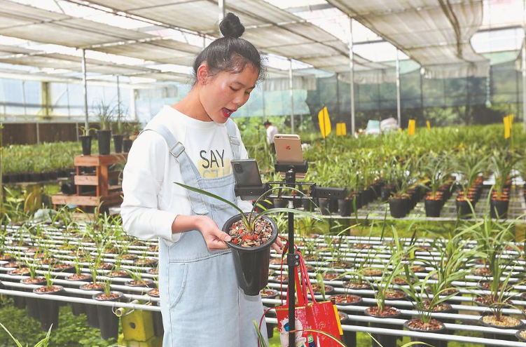 主播在连城的兰花基地里直播带货。