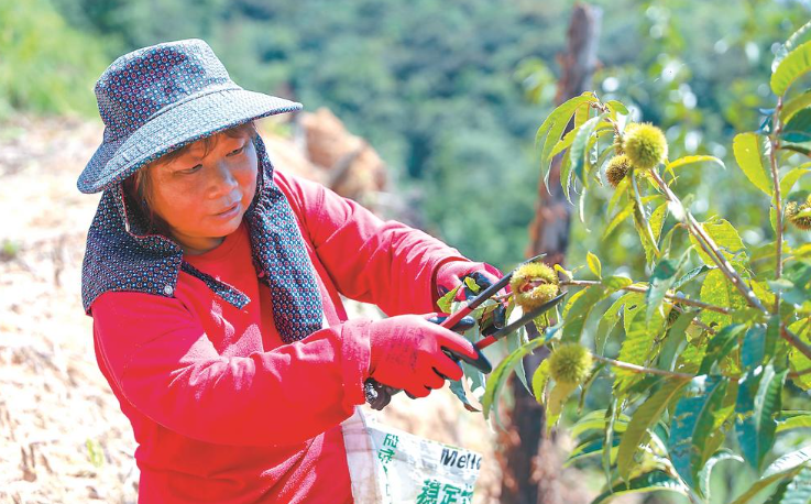 东峰镇长溪村,林农采摘成熟的锥栗。 东南网10月20日报道(福建日报记者 吴鹏 通讯员 黄杰敏 魏剑生 摄) 入秋后的太阳依然炙热,建瓯市东峰镇长溪村锥栗山上,满山遍野的锥栗树,沉甸甸的果实压满枝头,绽开的锥栗里藏着圆滚滚的“巧克力”。据了解,建瓯是中国首个“名特优经济林锥栗之乡”,锥栗栽培品种、面积、产量均居全国首位。 近年来,建瓯市东峰镇坚持以产业兴旺撬动乡村振兴,立足各村资源优势,因地制宜推进特色农产品种植产业发展,大力发展“一村一品一业”。去年,全镇完成社会生产总值17.9亿元,其中农林牧渔业产值达到9.8亿元。