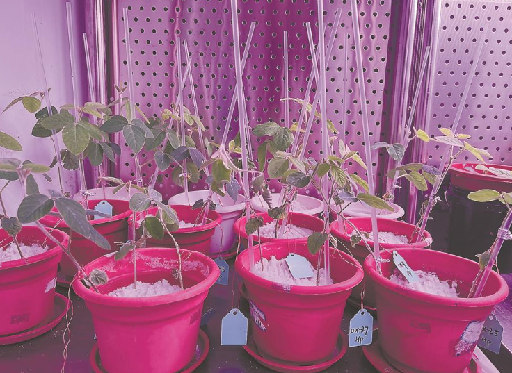 培养室内,正在进行大豆耐盐高效栽培试验。